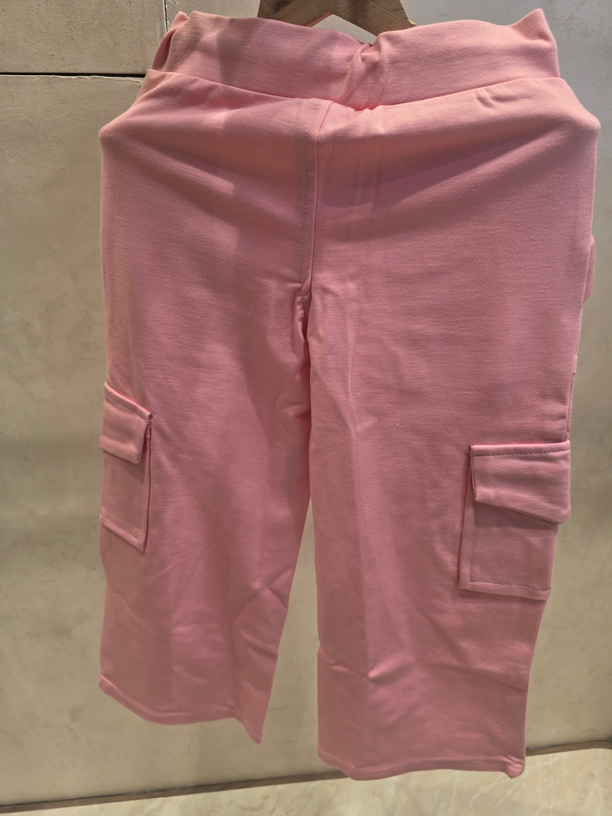 Baby Pink Cotton Cargo Pants with Smiley Logo & Six-Pocket Elastic Waist