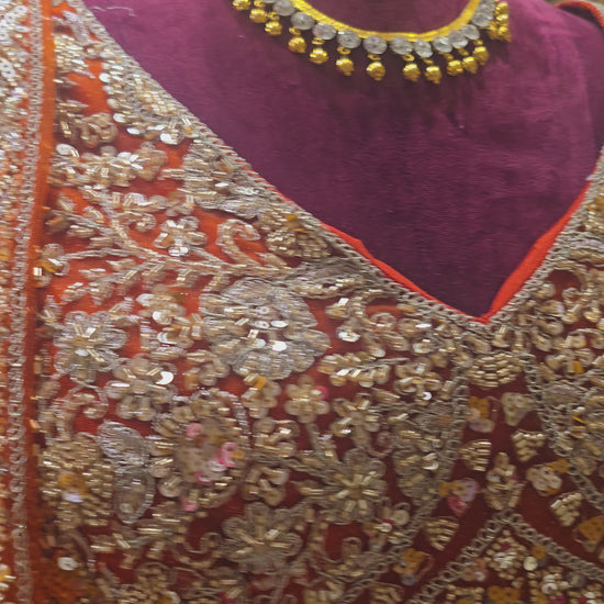 Orange Net Bridal Lehenga with Stone & Sequin Work | V-Neck Blouse with 3/4th Sleeves & Pink Dupatta