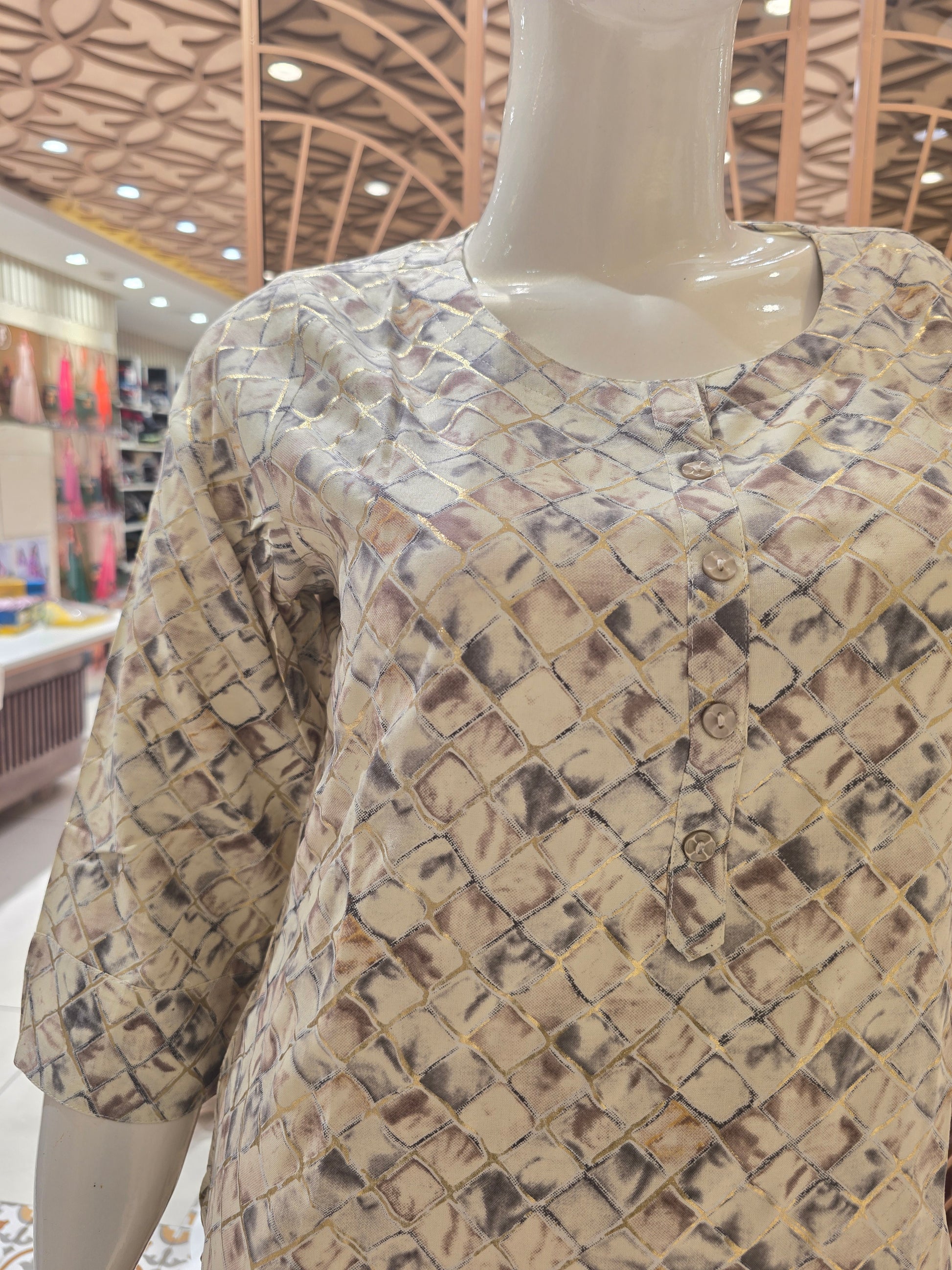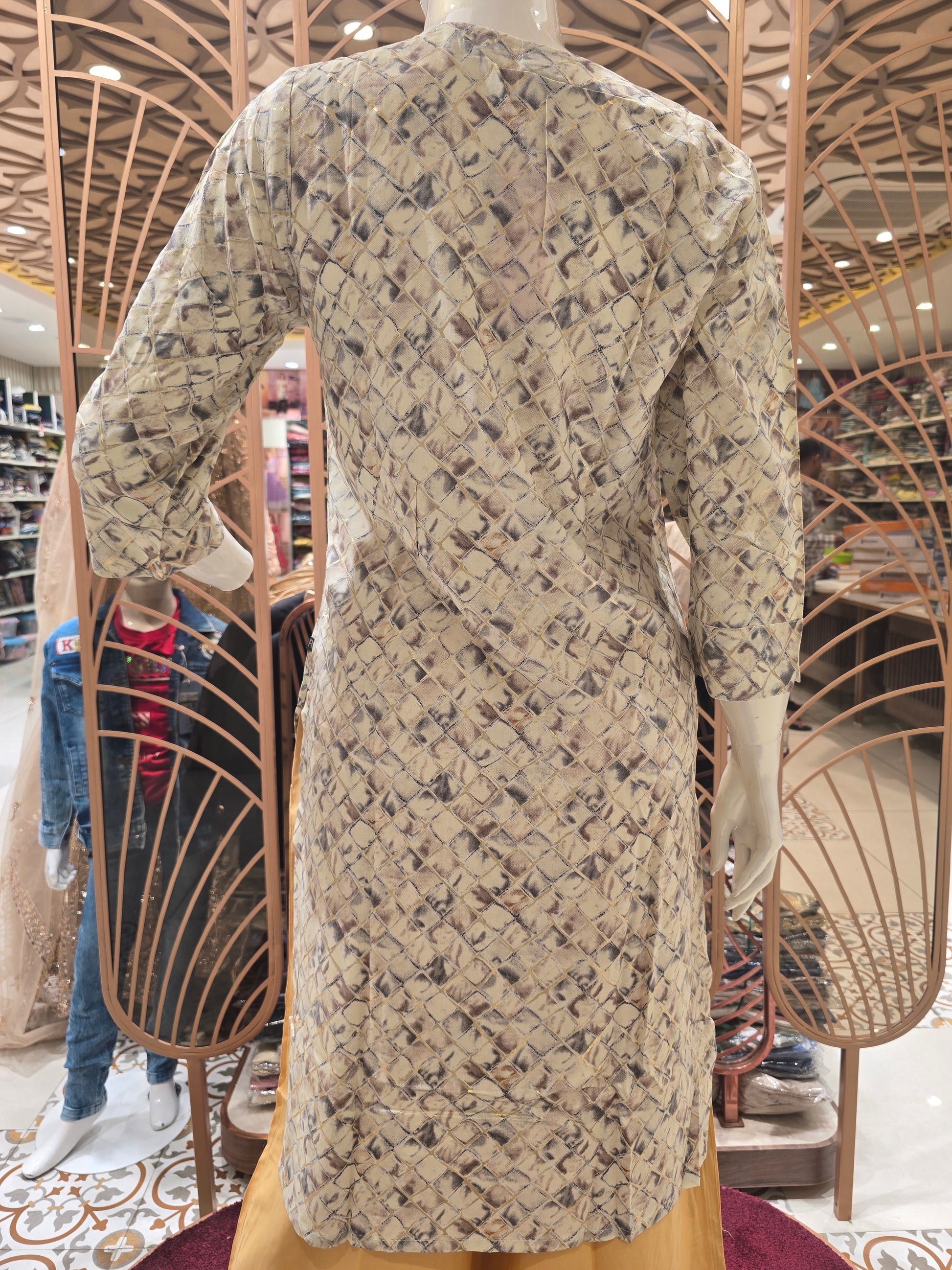 This cream women’s kurta is crafted from breathable linen cotton fabric, offering a soft and comfortable feel for everyday wear. Designed in a straight silhouette with a classic round neckline, it features subtle printed work that adds understated elegance. Lightweight and easy to style, this kurta is perfect for casual outings, office wear, and daily use.