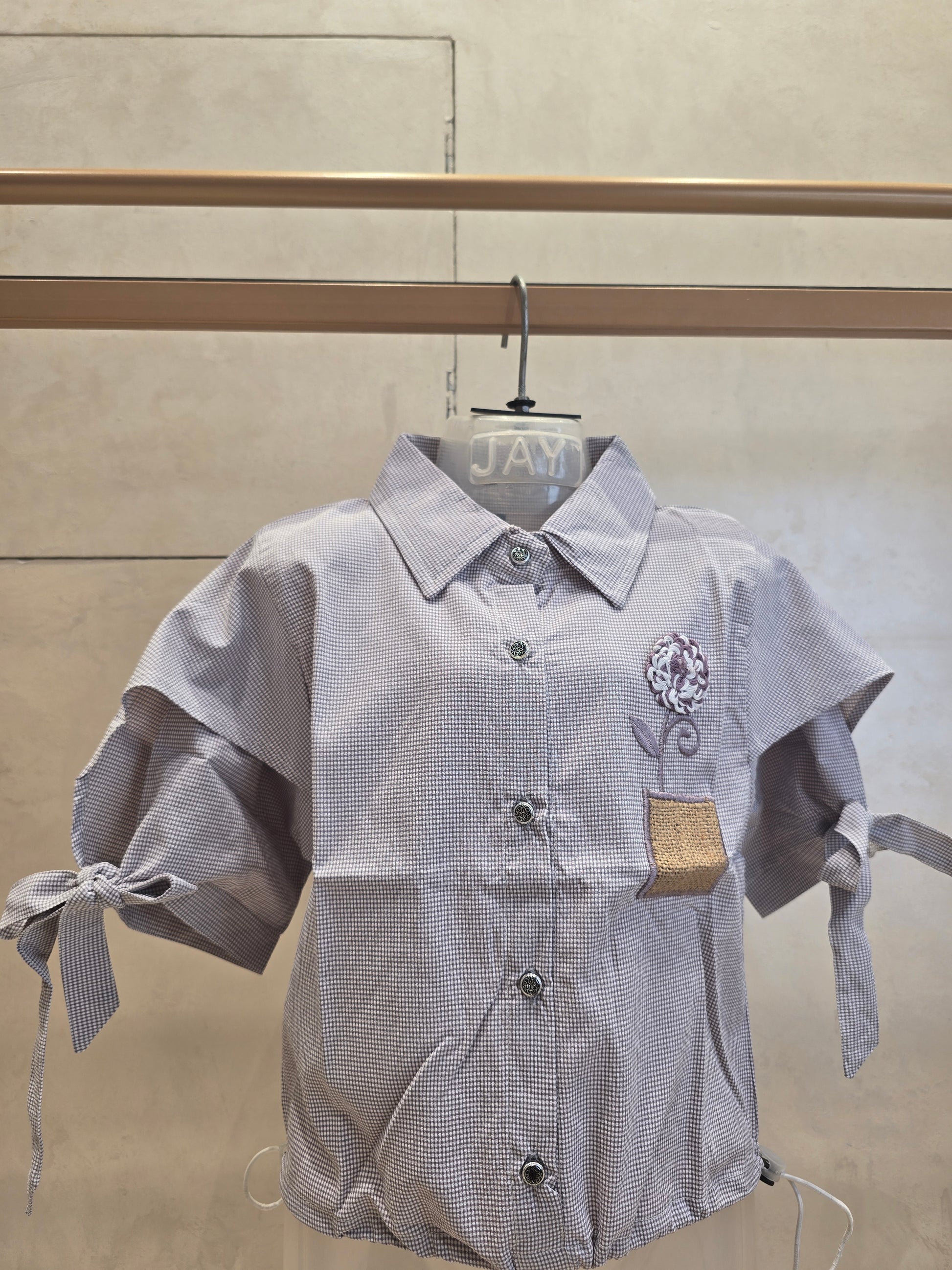 Light Grey Micro-Checked Cotton Mix Western Top for Girls with Dual-Tone Floral Detail & Tie-Up Sleeves – Party Wear