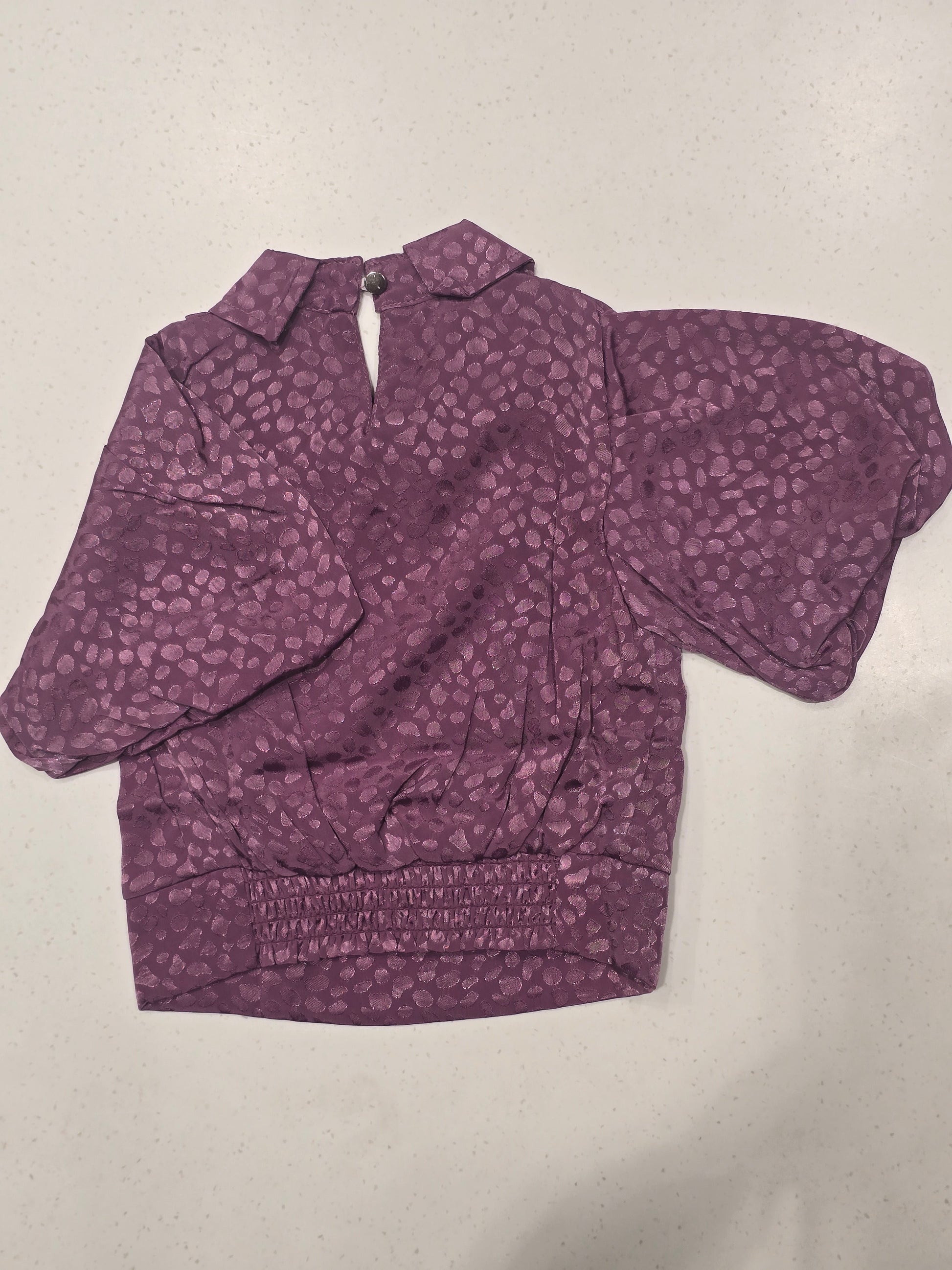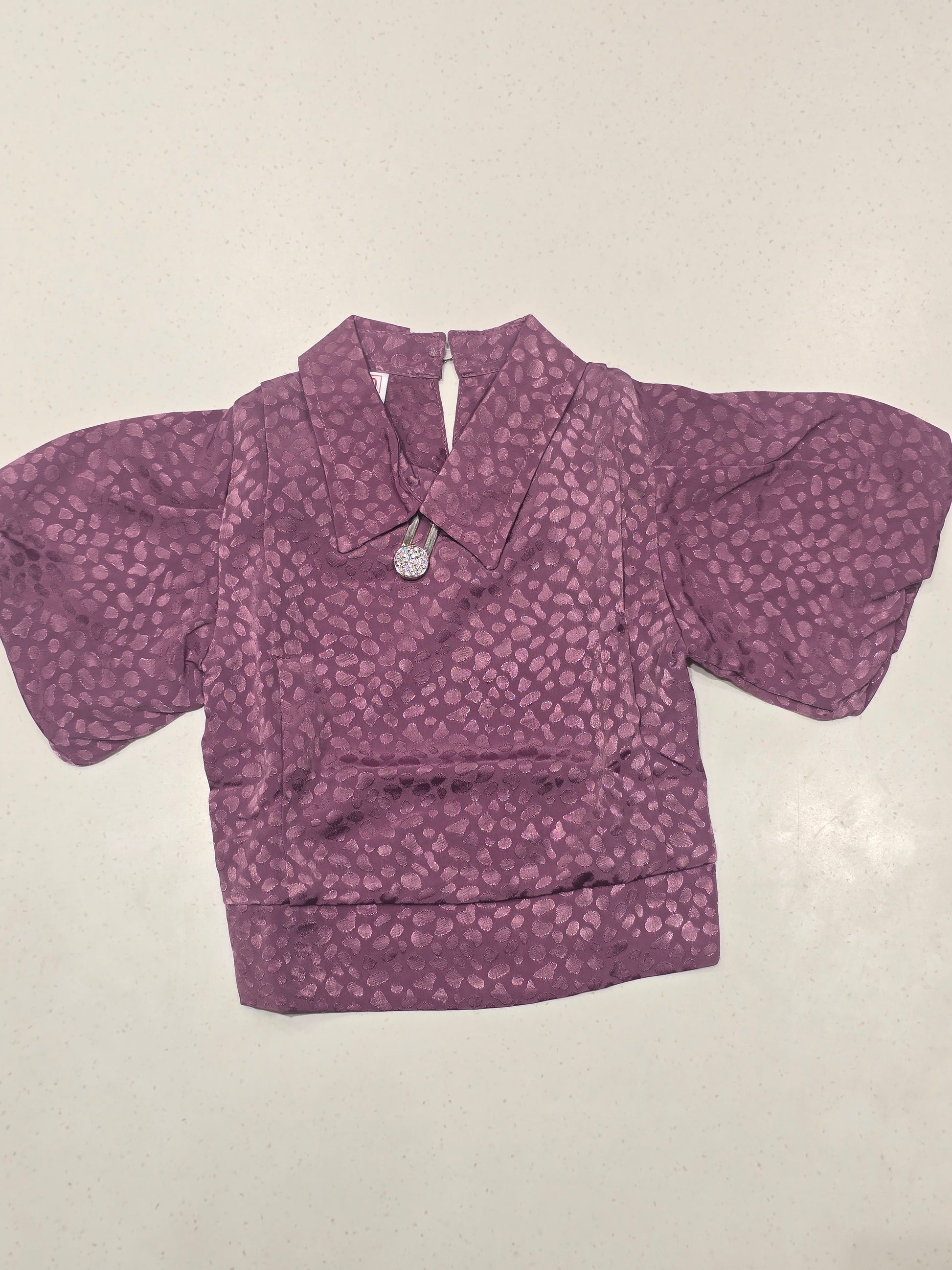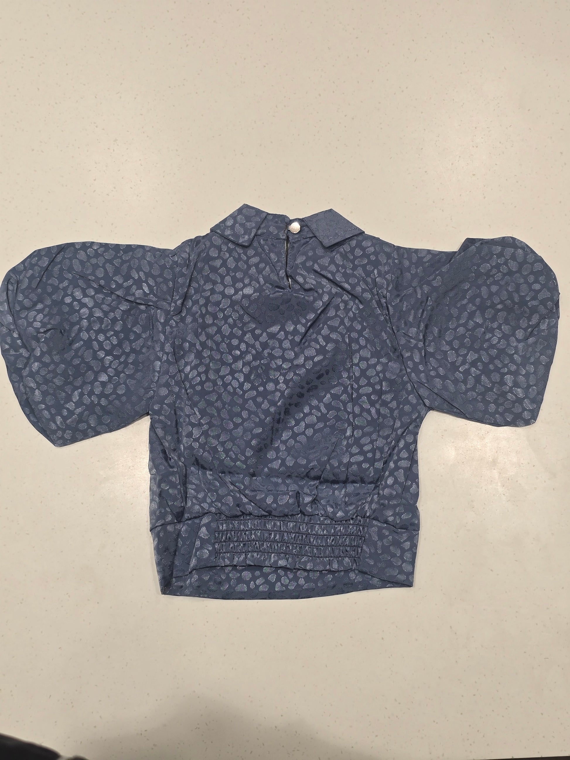 This dark blue fancy top is crafted from soft crepe chiffon fabric, offering a lightweight and stylish look for little girls. Designed with a smart collar neckline and elegant buff sleeves, it adds a fashionable touch to everyday wear. Comfortable and easy to style, this top is perfect for casual outings, playdates, and special occasions.