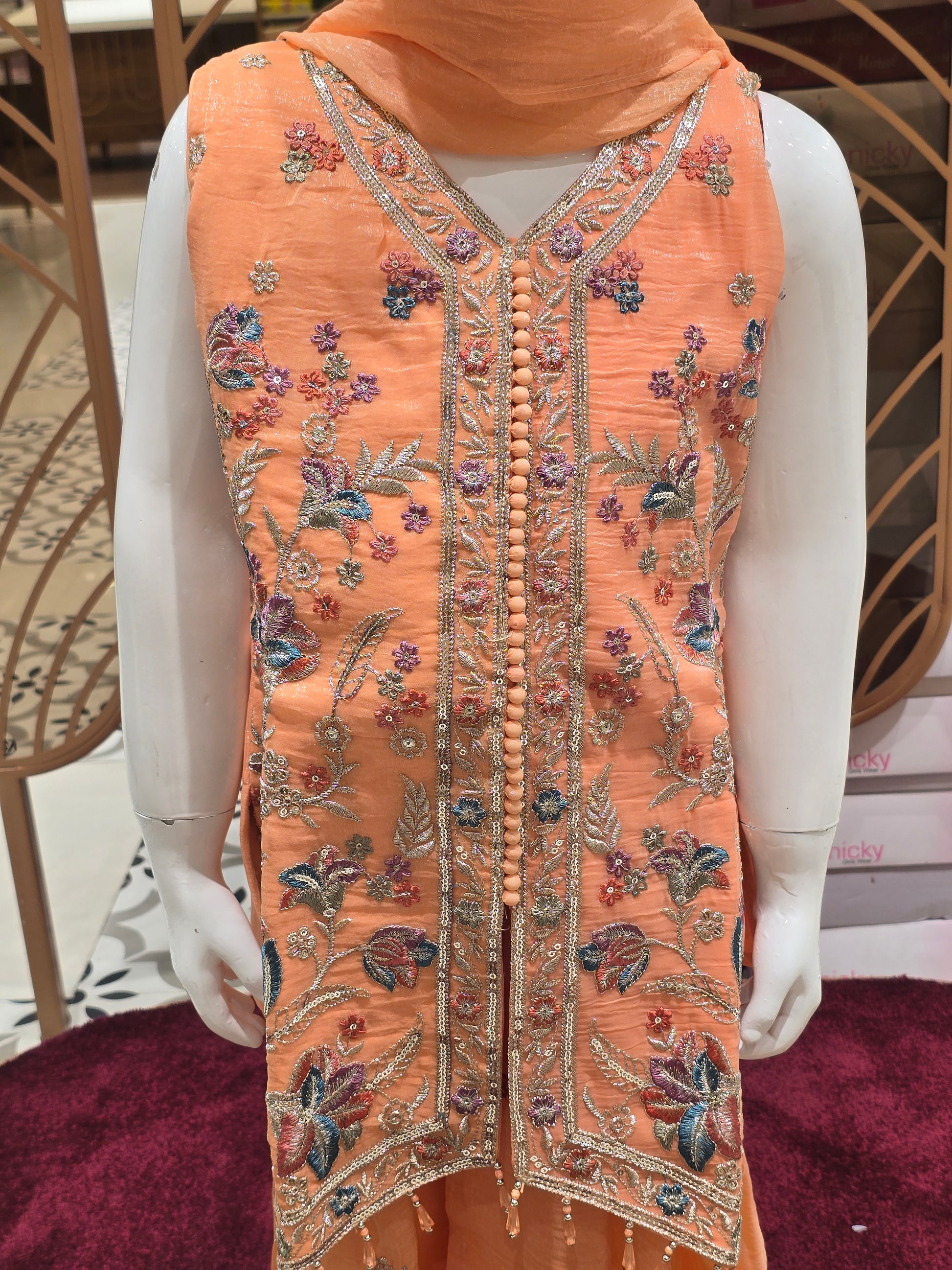 Crafted in soft crepe fabric, this peach sharara set features a graceful V-neck design that enhances its elegant festive appeal. The lightweight texture offers comfort while creating a beautiful flowing silhouette. Perfect for weddings, celebrations, and cultural occasions, it blends traditional charm with modern styling. A refined ethnic ensemble designed for stylish festive wear.