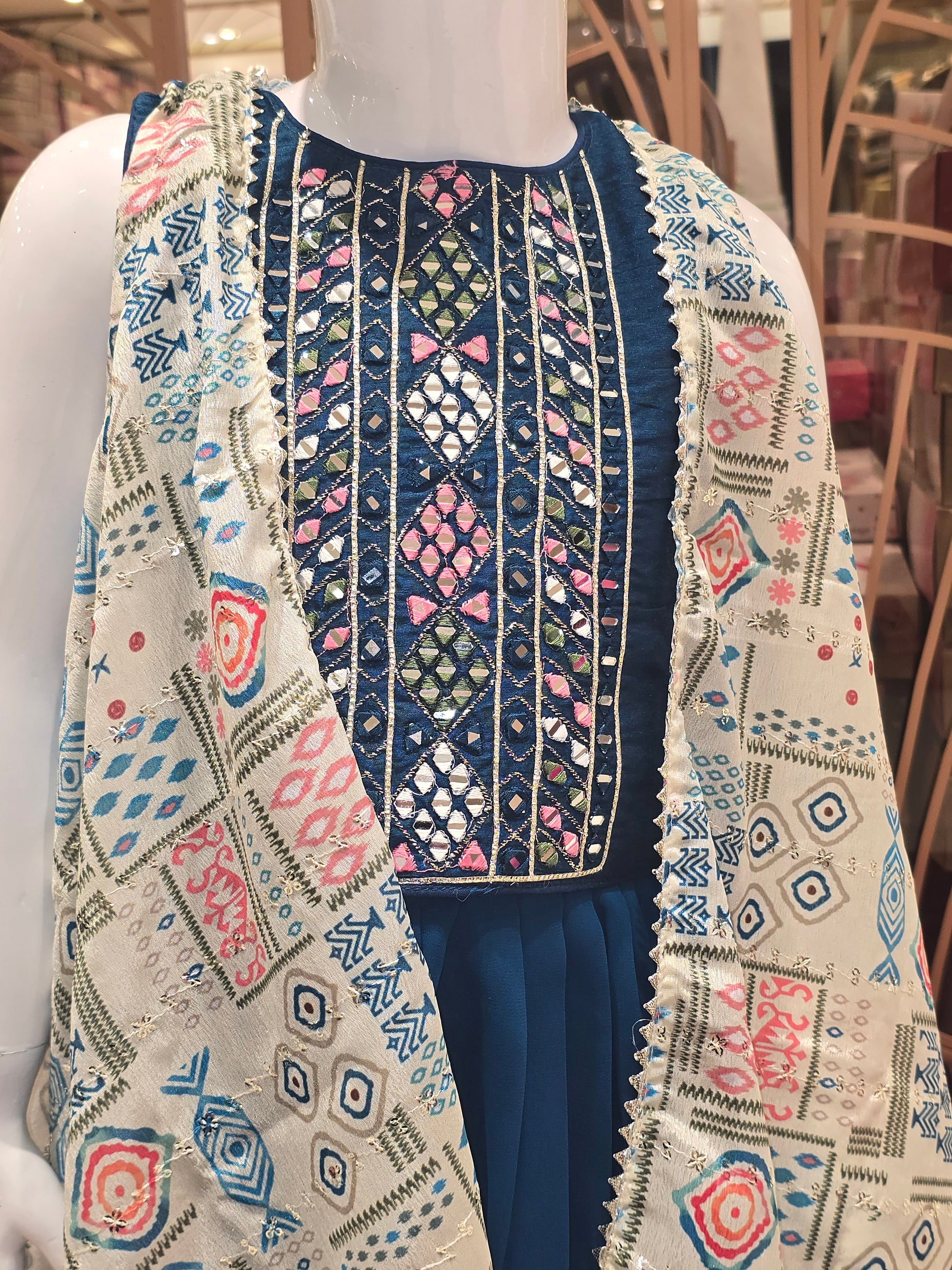 This peacock blue plazo set is crafted from soft crepe fabric, offering a lightweight and elegant festive look. The top features delicate mirror and thread work that adds a traditional touch, paired with a stylish open shrug for a layered silhouette. Comfortable and graceful, this three-piece set is perfect for celebrations, weddings, and special occasions.