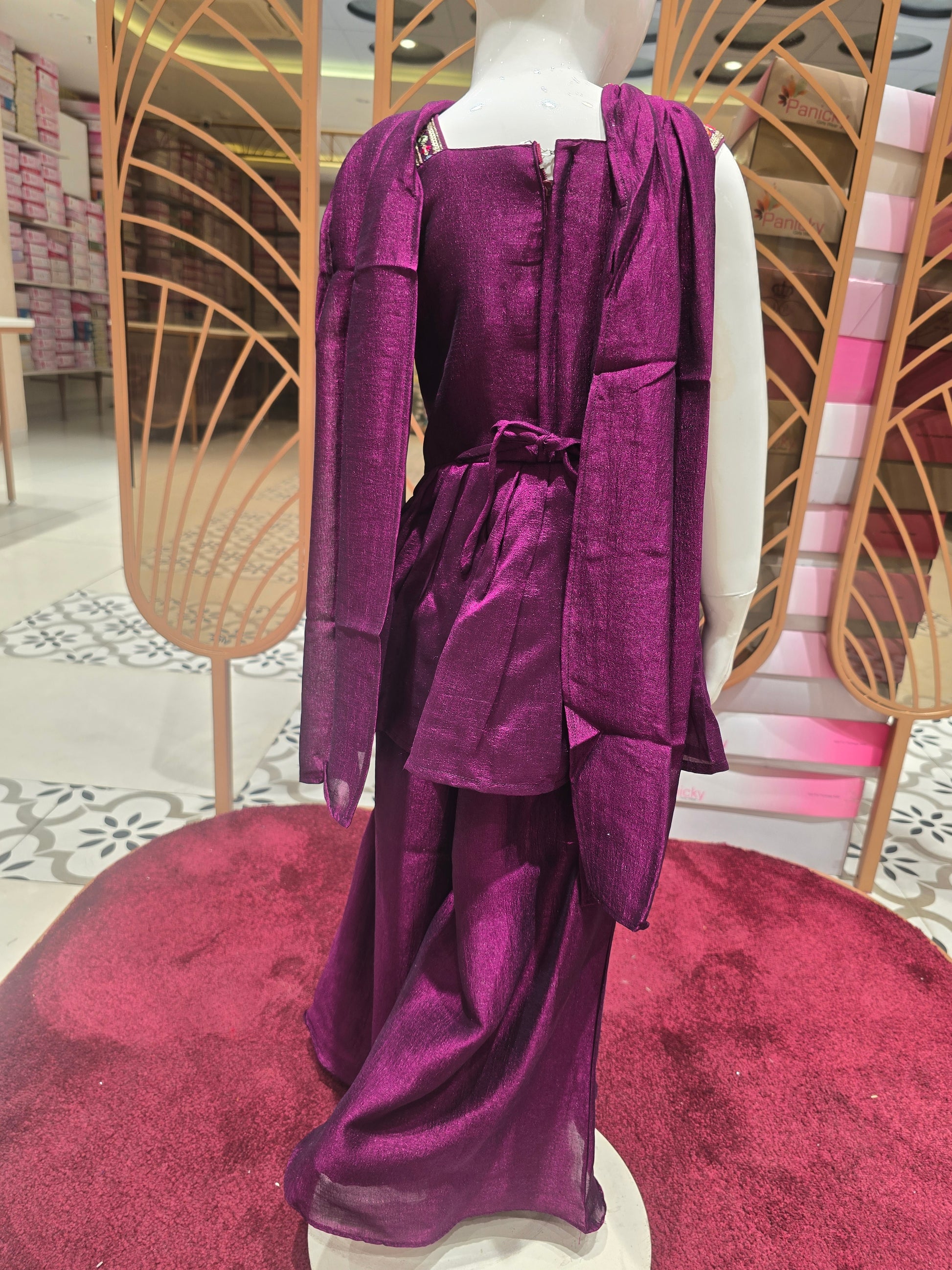 This wine crepe sharara set features a frock-style top designed with vibrant multicolour embroidery and delicate butta detailing for a festive appeal. Styled with elegant mega sleeves, it offers a graceful silhouette with comfortable movement. Lightweight and easy to wear, this sharara set is ideal for festive celebrations, family functions, and special occasions for young girls.