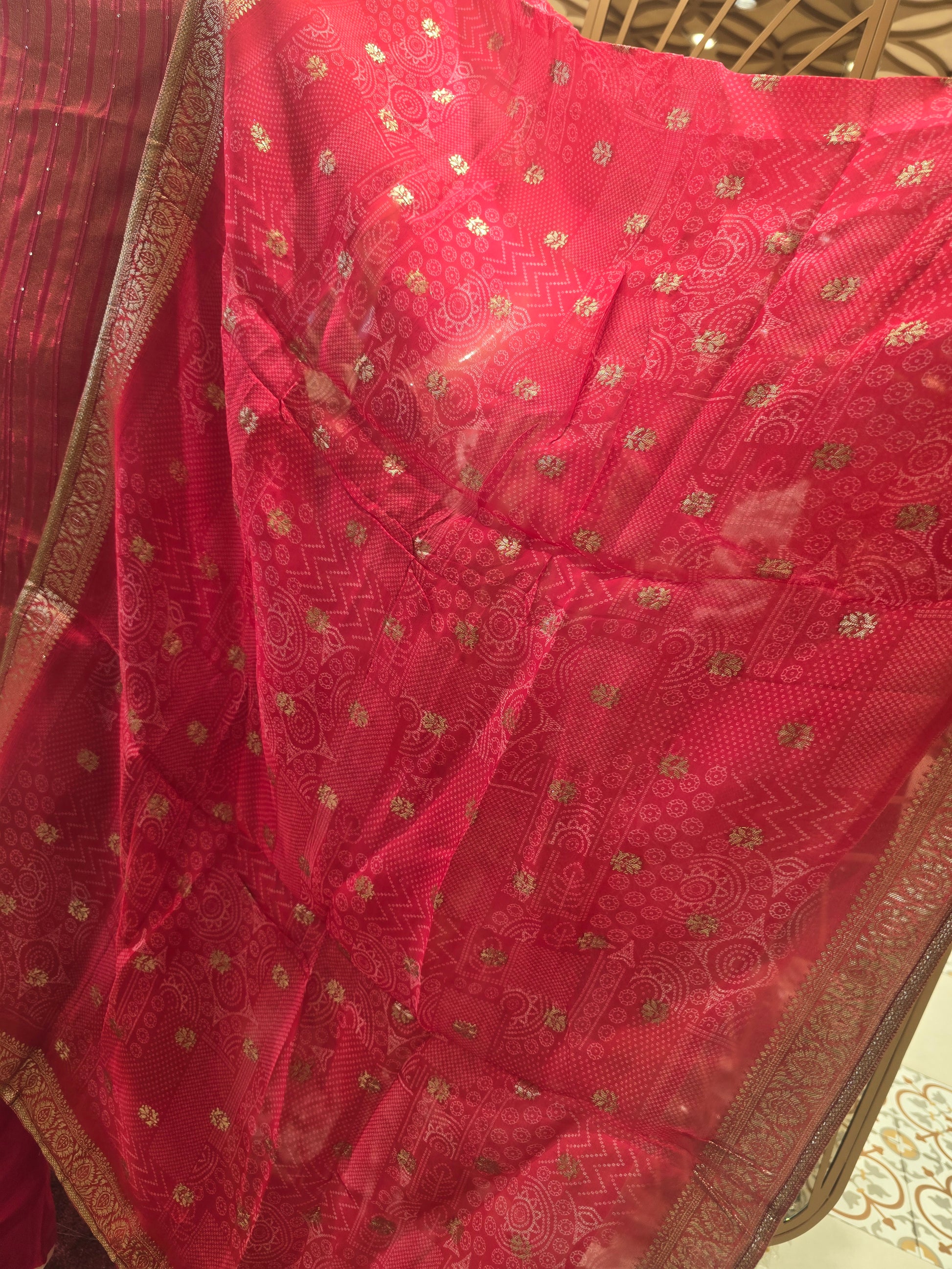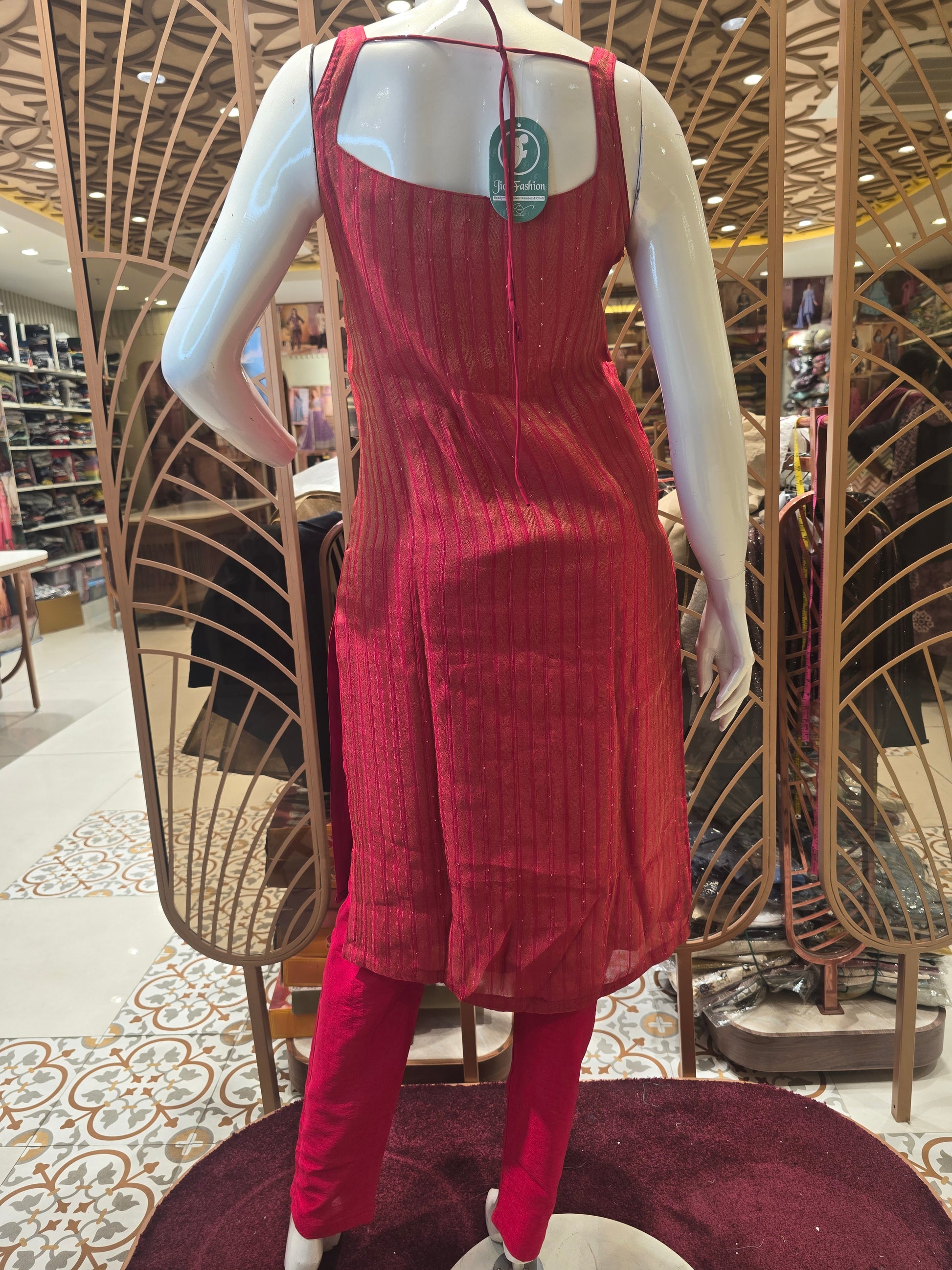 This stunning cherry pink dolla silk party wear set for women is elegantly designed with delicate micro sequin detailing spread across the body, enhanced by subtle zari work for a refined festive glow. The straight-cut silhouette, paired with a graceful round neckline and stylish spaghetti sleeves, creates a modern yet sophisticated look. Crafted from luxurious dolla silk fabric and complemented with a Banarasi dupatta, this outfit is perfect for parties, festive celebrations, receptions, and special occasions, offering a beautiful balance of elegance, comfort, and contemporary charm.