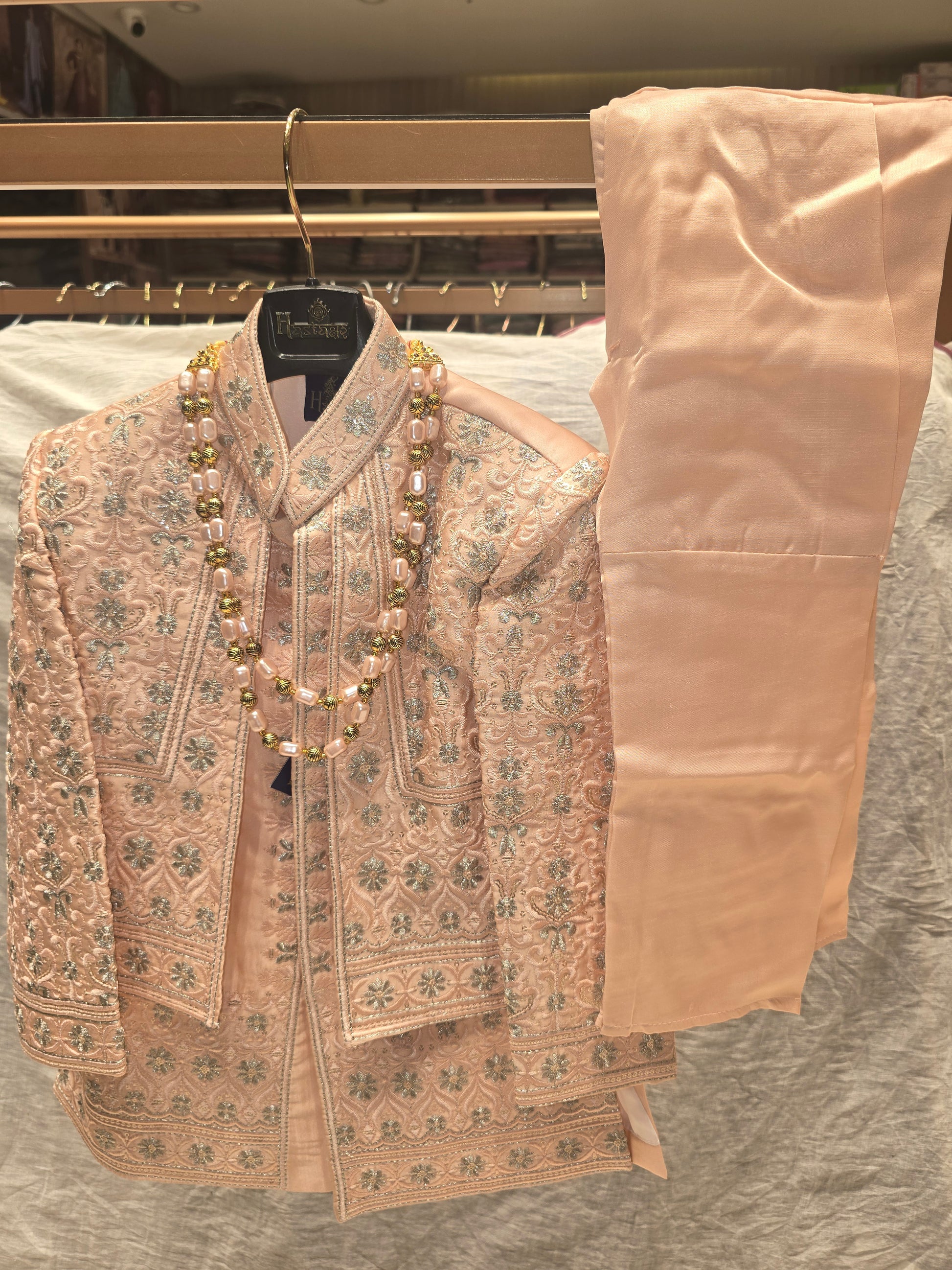 This peach dupion silk indo-western set is crafted to deliver a refined festive look with a soft sheen and rich texture. Detailed with silver thread embroidery and subtle micro sequin work, it is finished with a matching mala for a complete traditional ensemble. Comfortable in fit and elegant in drape, this set is ideal for weddings, festive celebrations, and special family occasions for young boys.