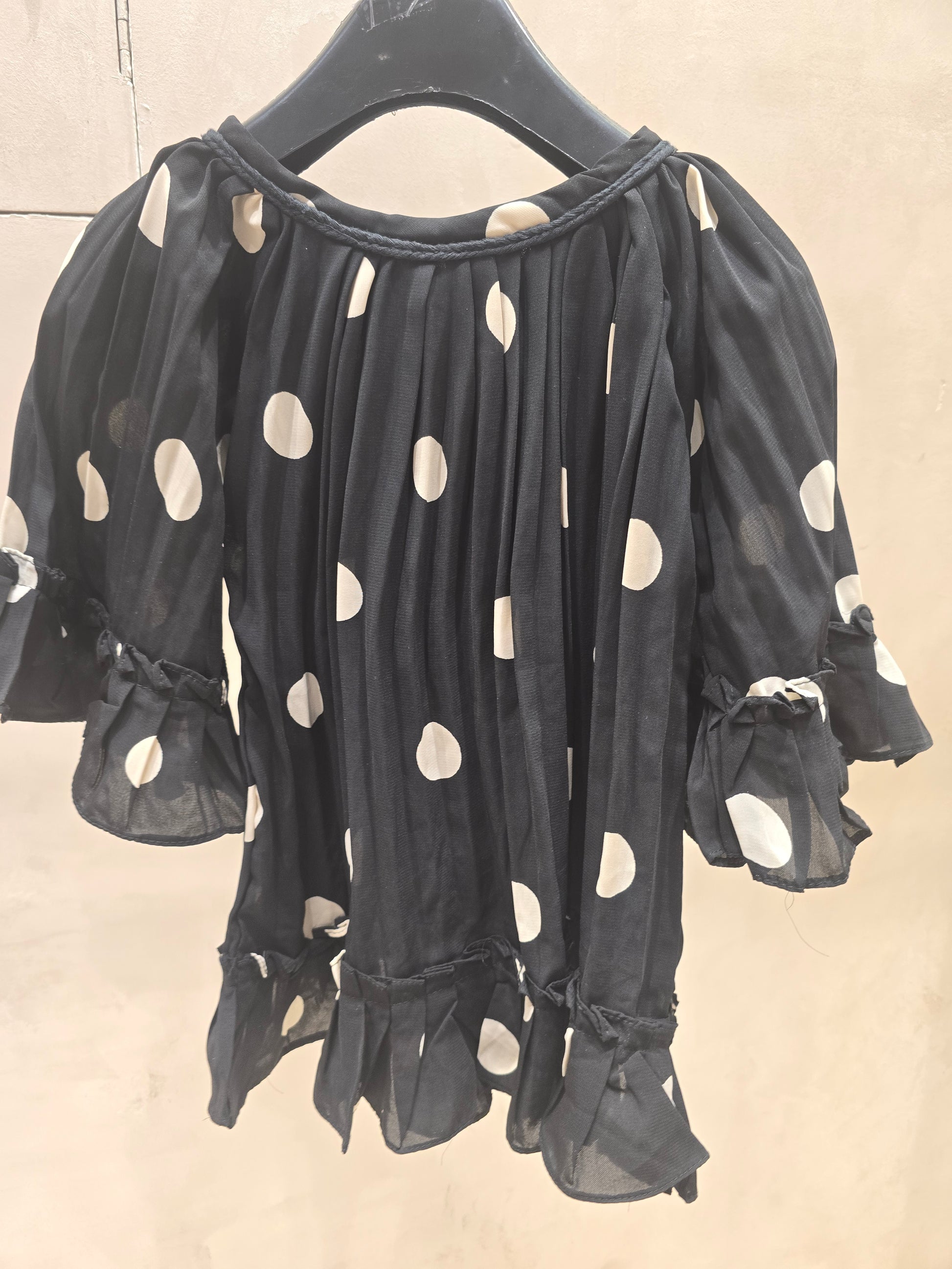 This black western top is crafted from lightweight georgette fabric and features classic white polka dots spread elegantly across the body. Designed with stylish bell sleeves, it adds a playful yet chic touch to a comfortable everyday silhouette. Soft, airy, and easy to wear, this top is perfect for summer outings, casual wear, and stylish day looks.