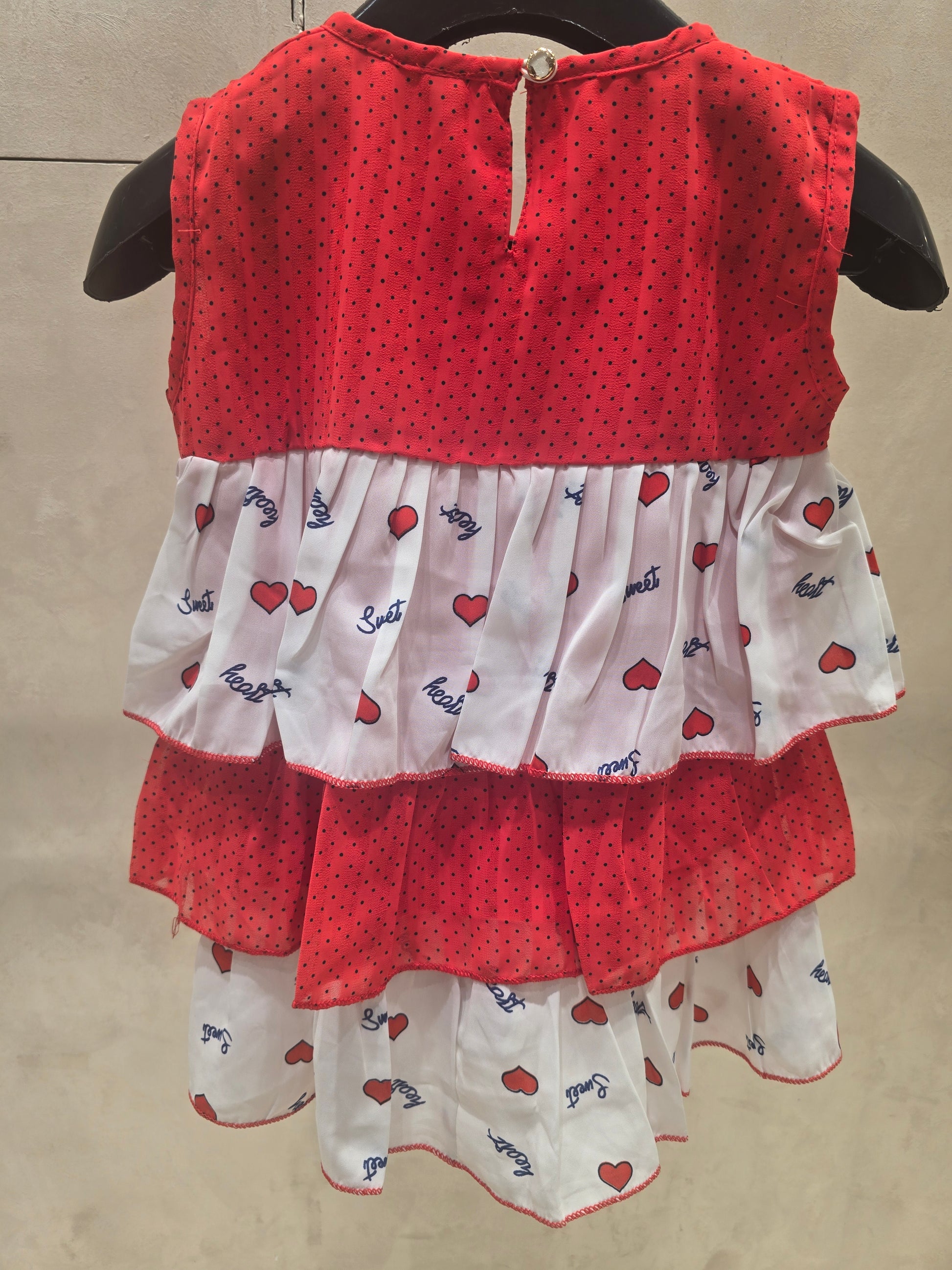 This red and white western top is crafted from lightweight chiffon and features a stylish step-by-step layered cut for a graceful flow. Designed with a classic round neckline, it is accented with a unique jhumka-style brooch that adds a festive charm to the look. Soft, airy, and comfortable, this top is perfect for summer outings, casual gatherings, and special daywear.