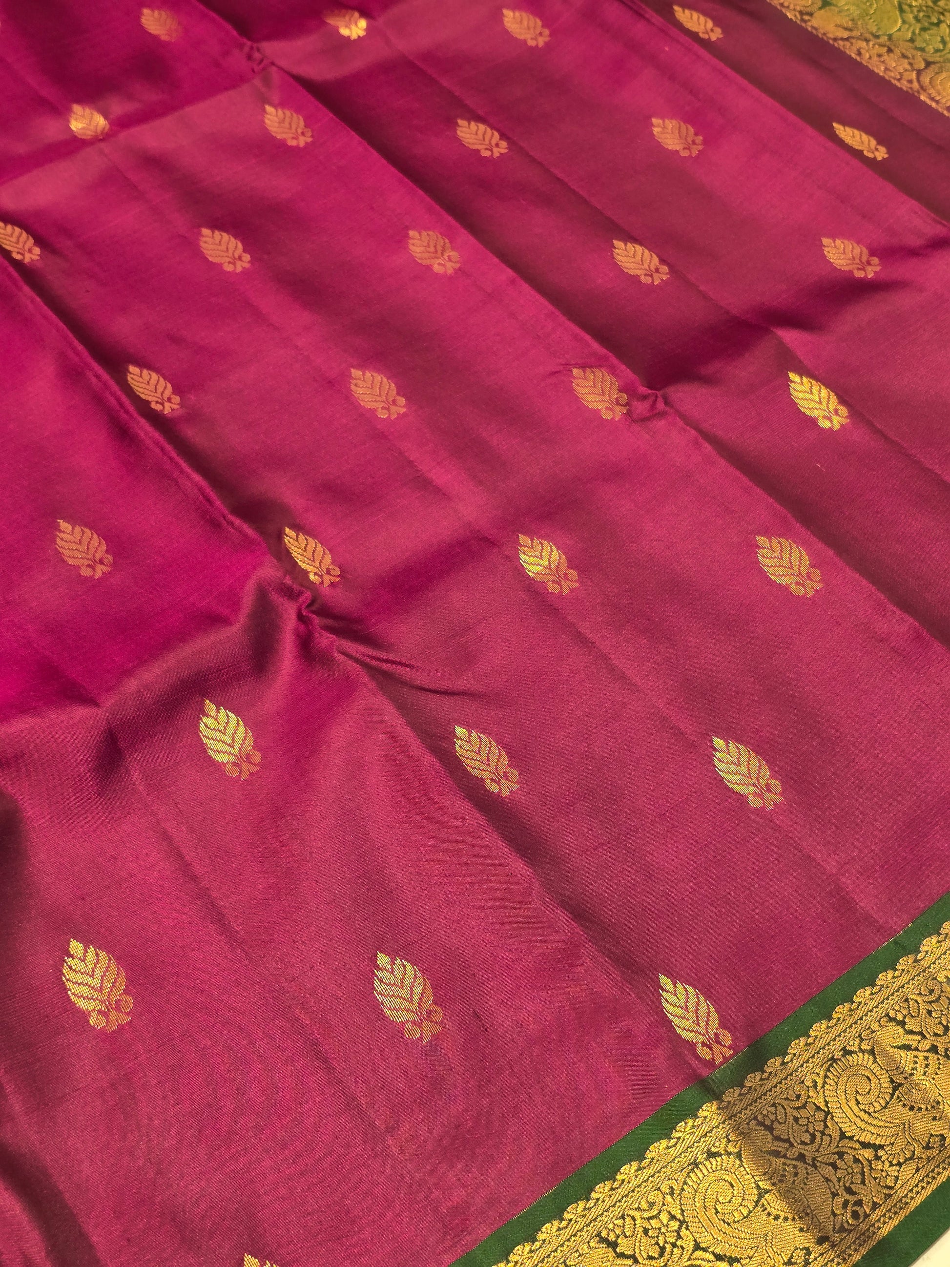 Handloom pure Kanjivaram silk with small leaf styled motifs and small traditional peacock designed border, rich pallu