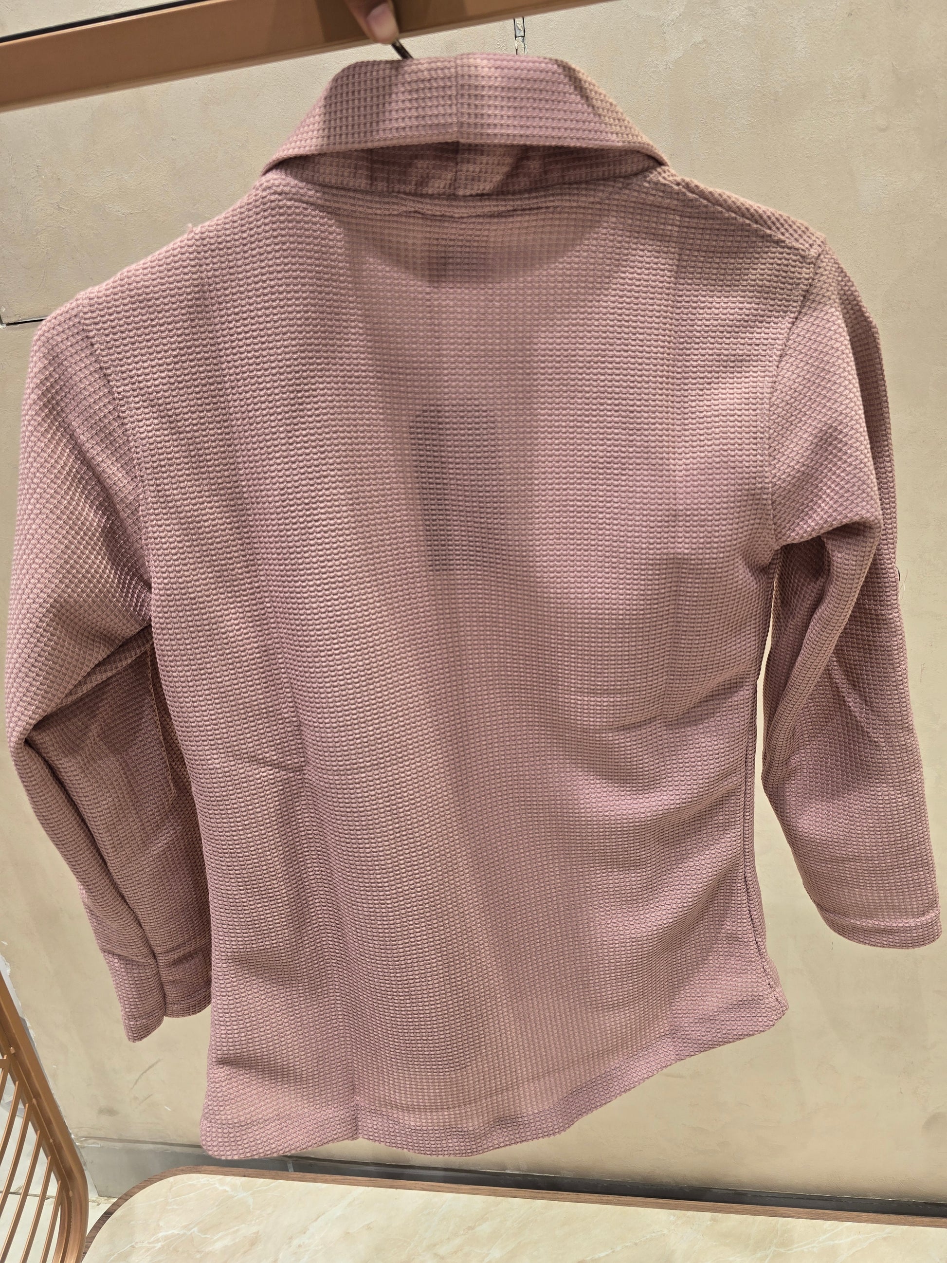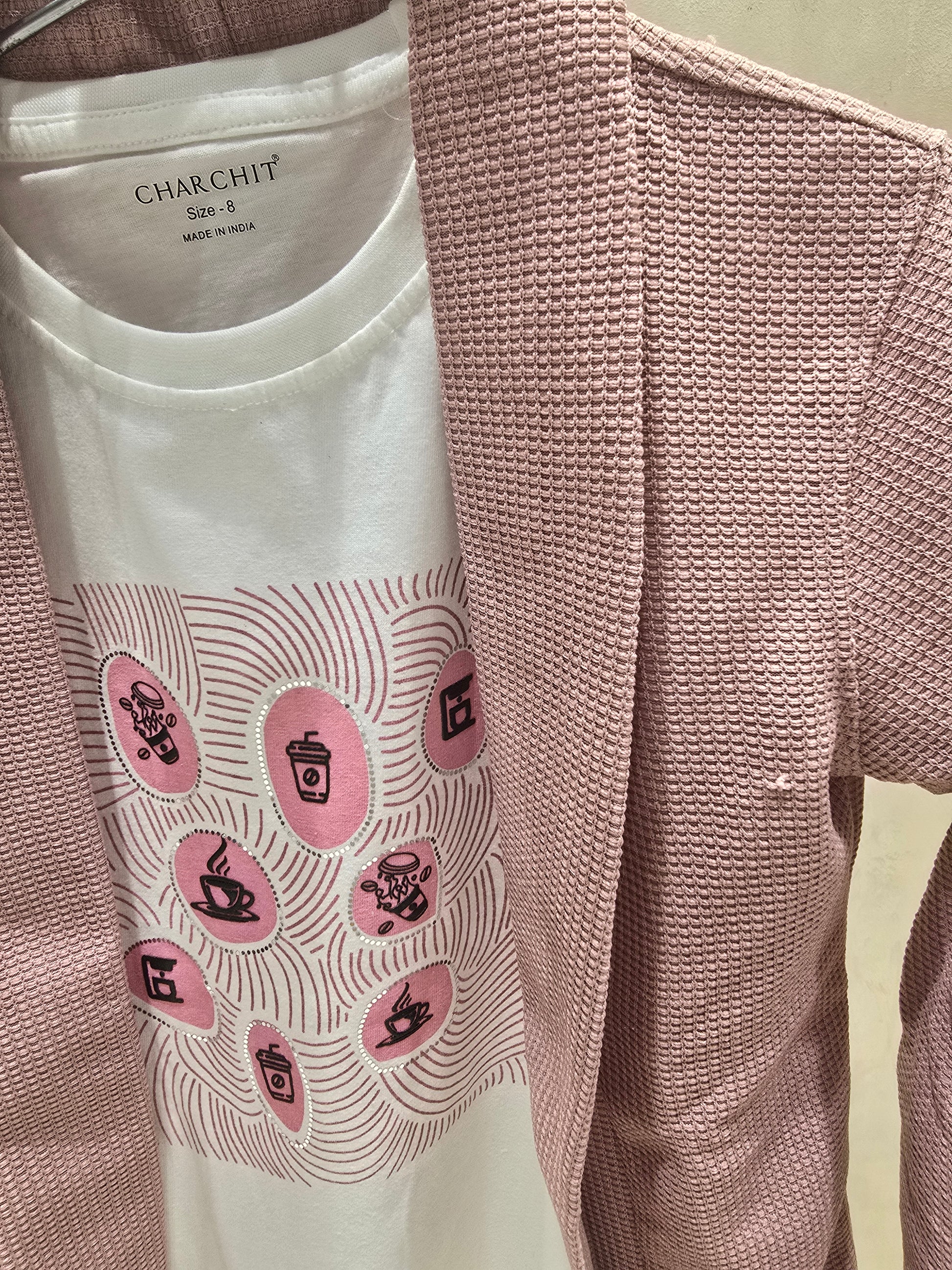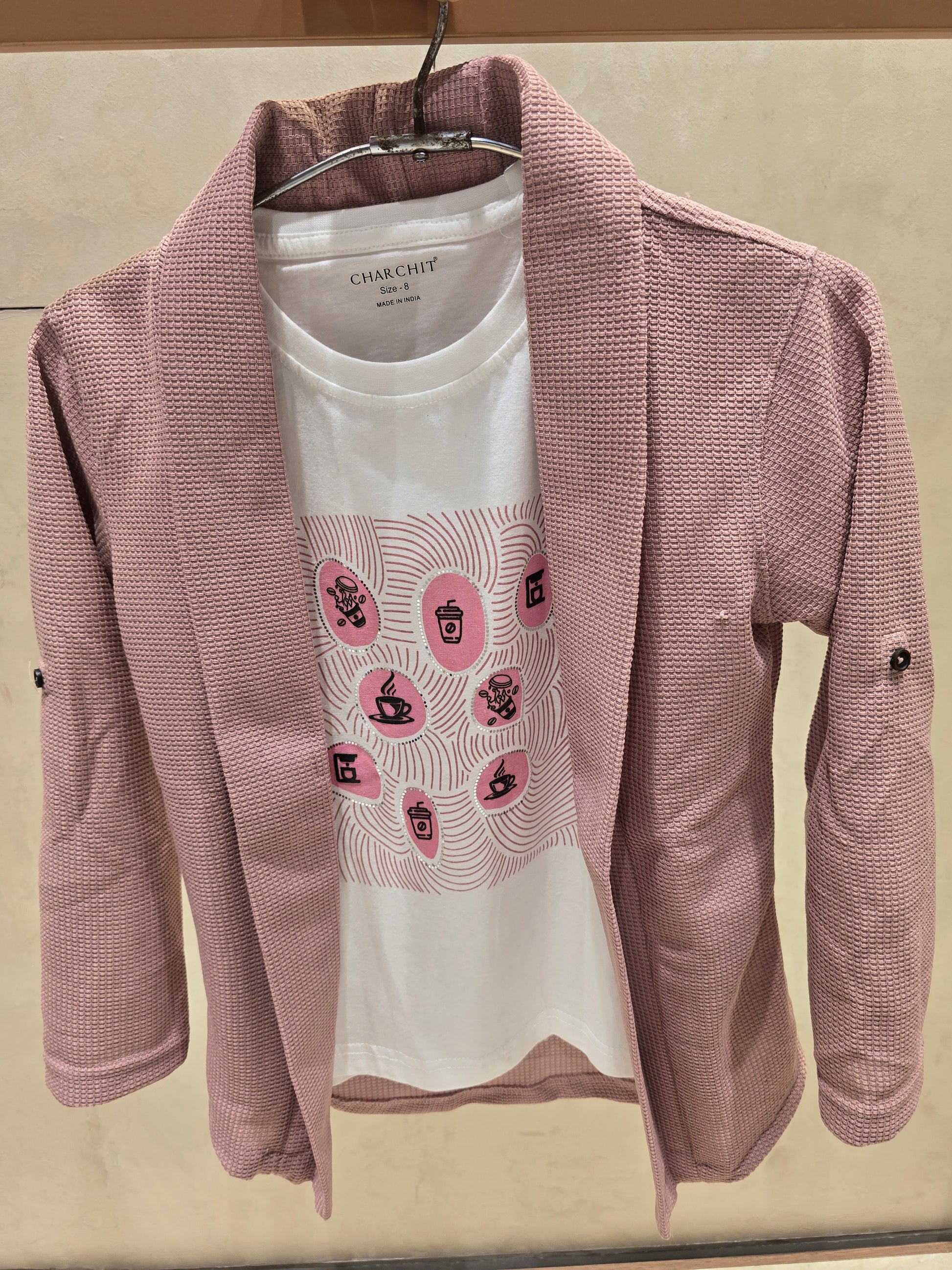 This peach-colored jute sturg set is paired with a stylish printed white T-shirt, making it a perfect blend of comfort and fashion for young boys. The full-sleeve jute shrug adds a trendy layered look, while the soft cotton T-shirt ensures all-day comfort. Ideal for outings, casual wear, and everyday use, this two-piece outfit offers durability, breathability, and a smart modern design that kids love.