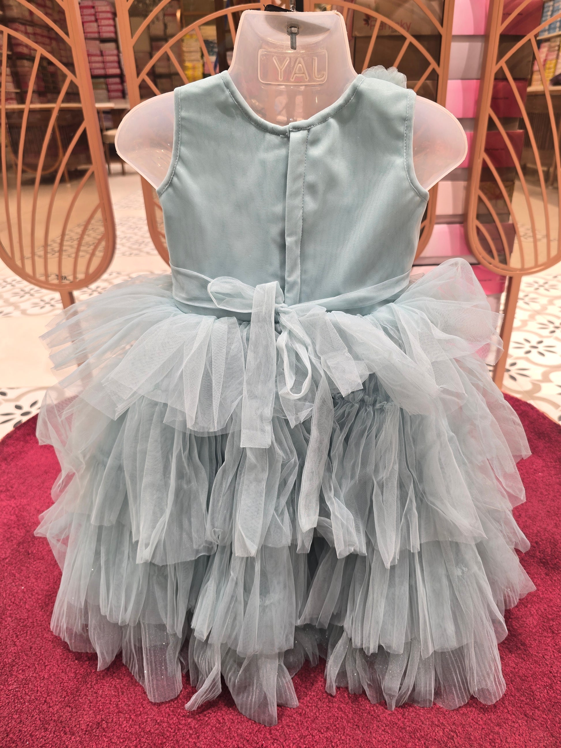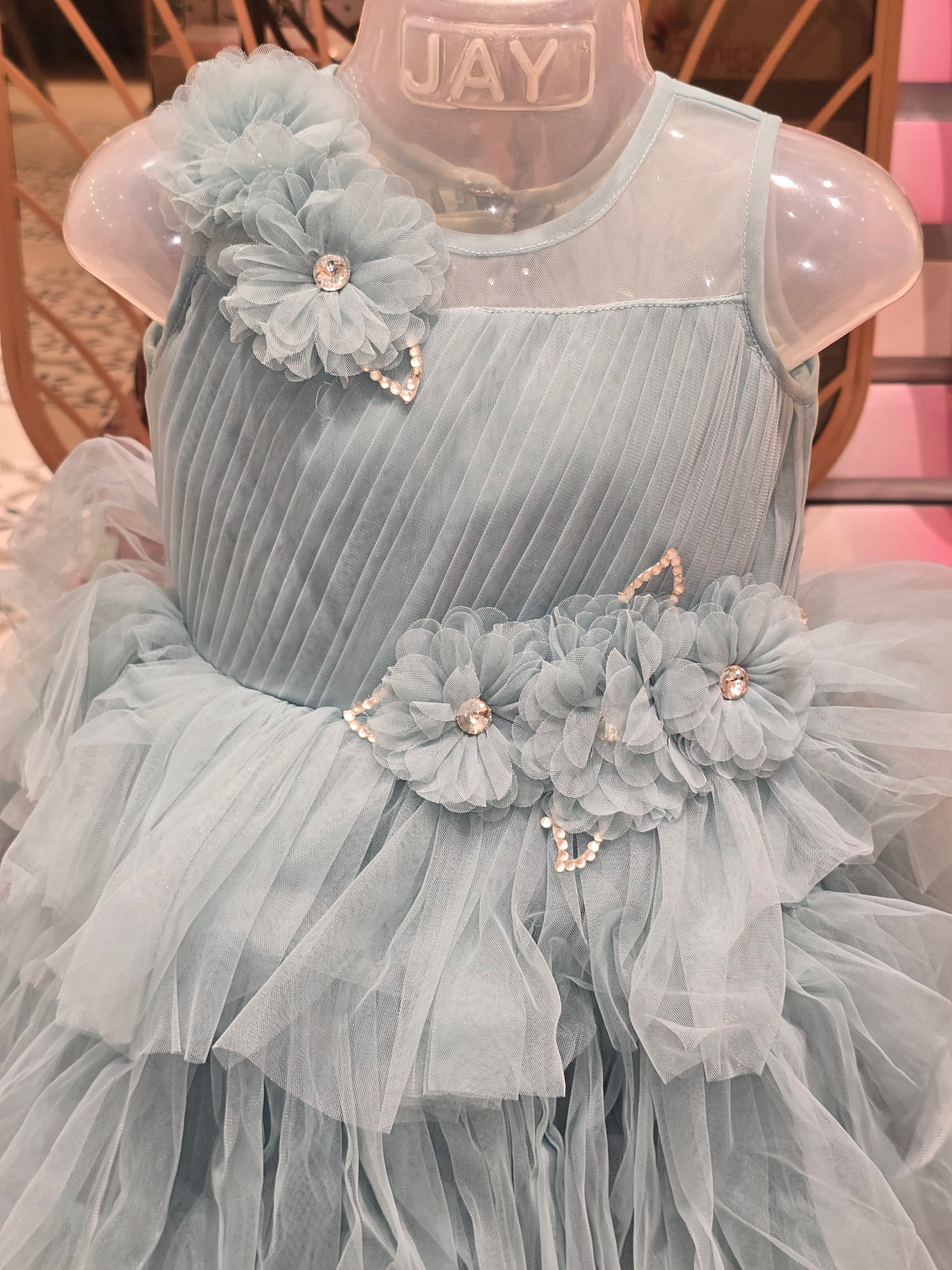This ocean blue party wear frock is crafted from soft knitted fabric, offering comfort with a stylish festive touch. Designed in a trendy stay-cut silhouette, it features a charming floral accent that enhances its elegant look. Lightweight and easy to wear, this gown is perfect for birthdays, celebrations, and special occasions.