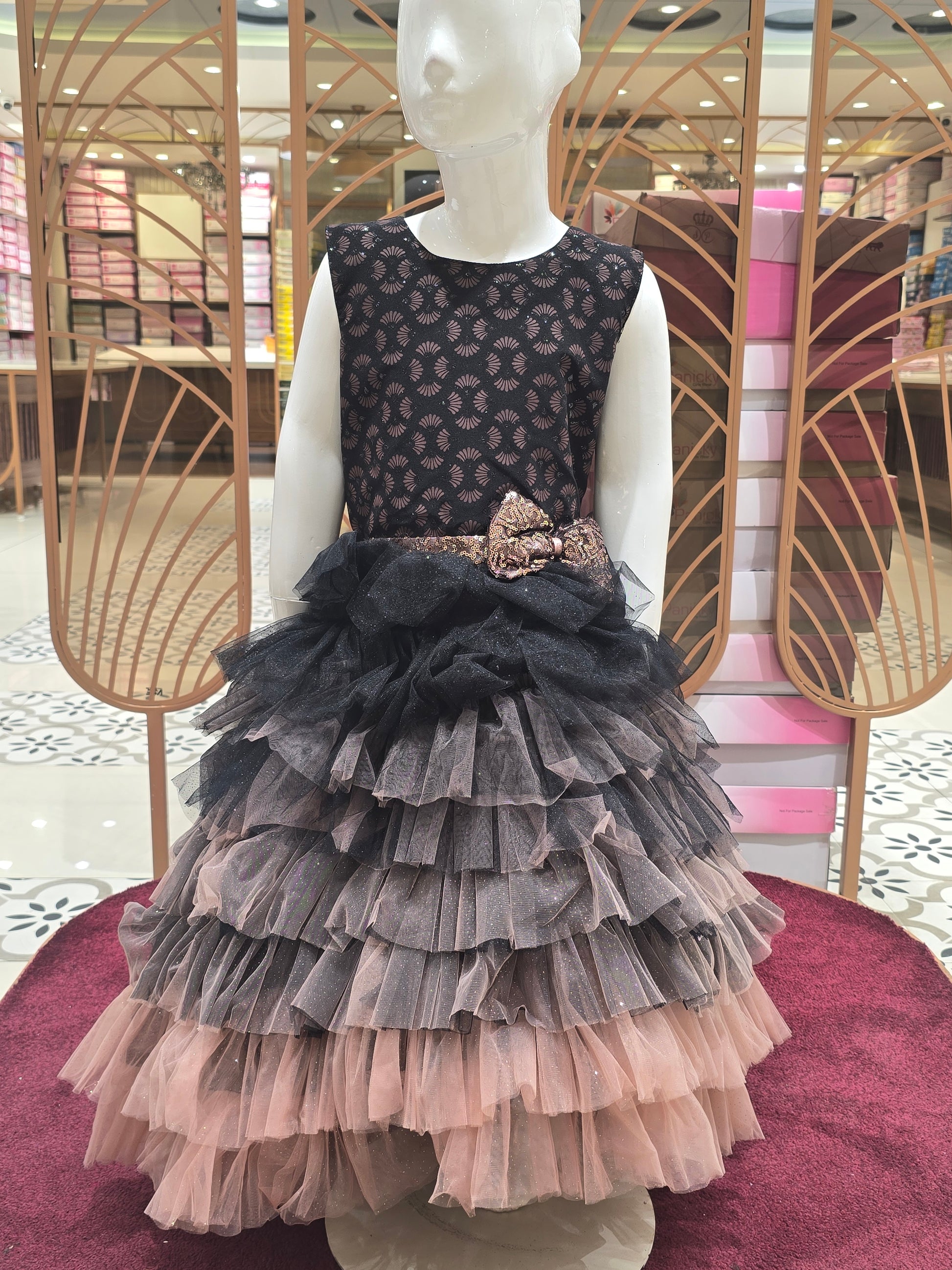 This party wear short frock is crafted from soft knitted fabric in a striking black and peach colour combination. Designed with an eye-catching seven-layer step-by-step frill skirt, it features a charming sequin bow detail and a classic round neckline for a festive finish. Comfortable yet statement-making, this frock is perfect for birthday parties, celebrations, and special occasions.