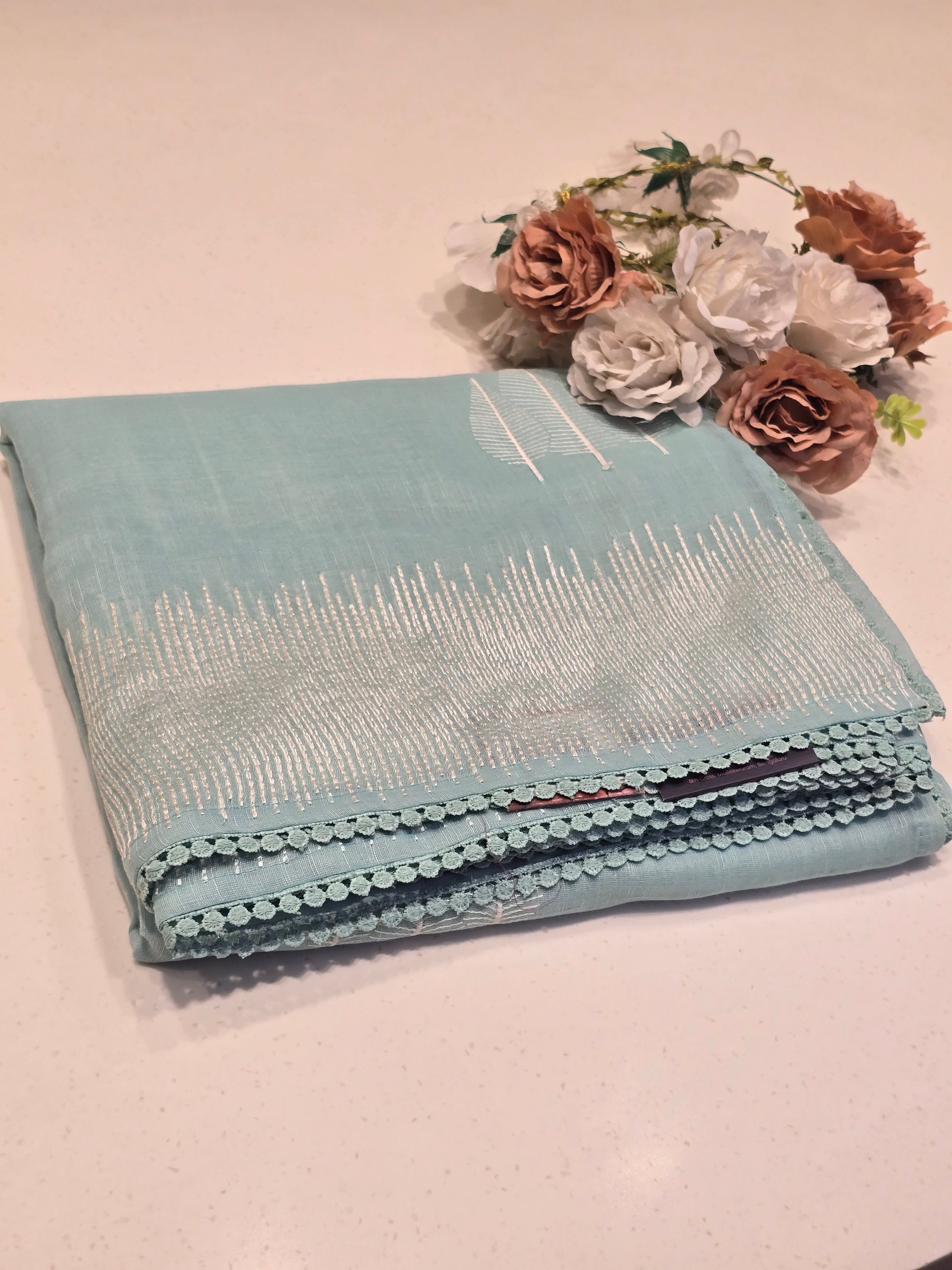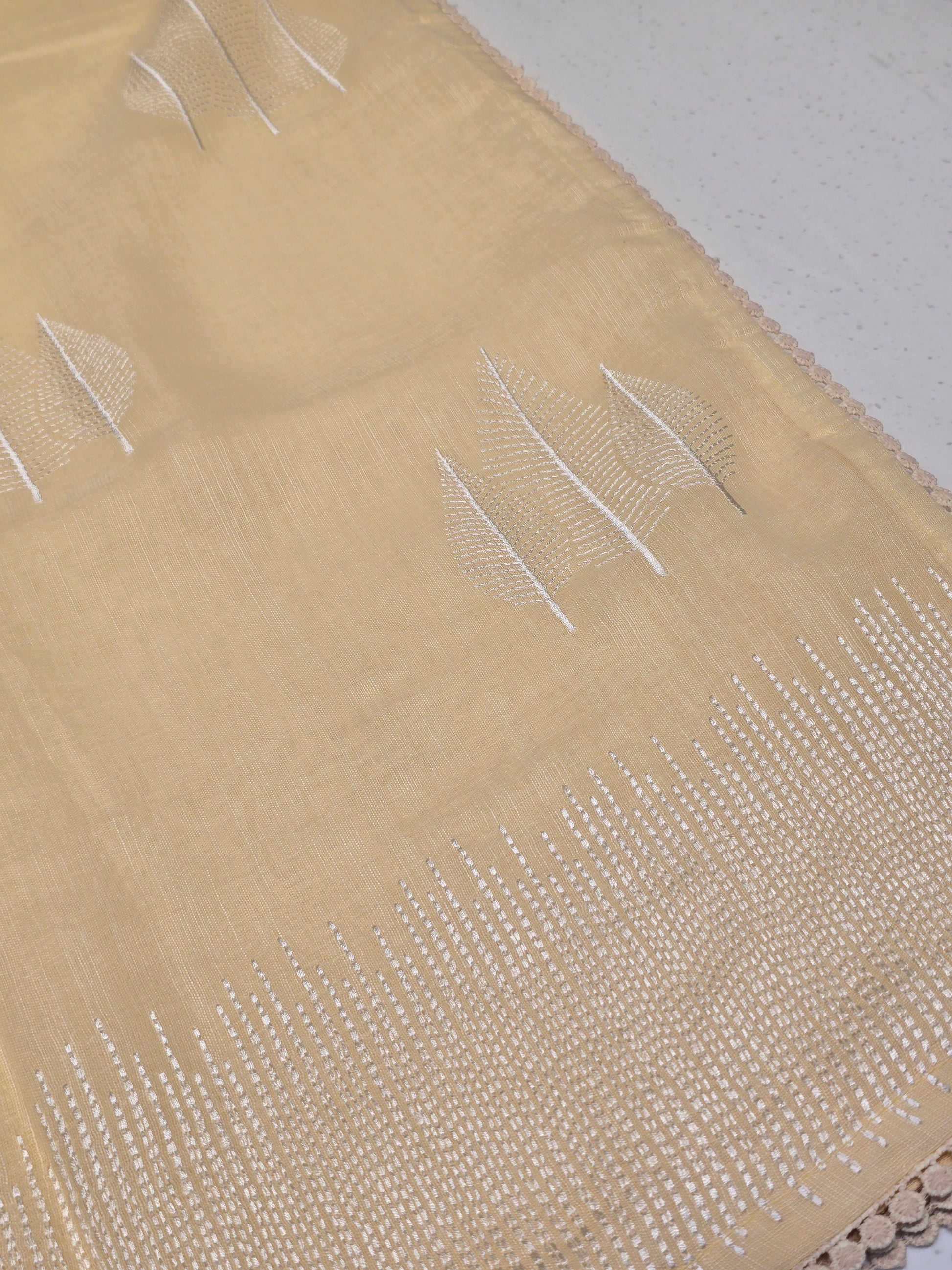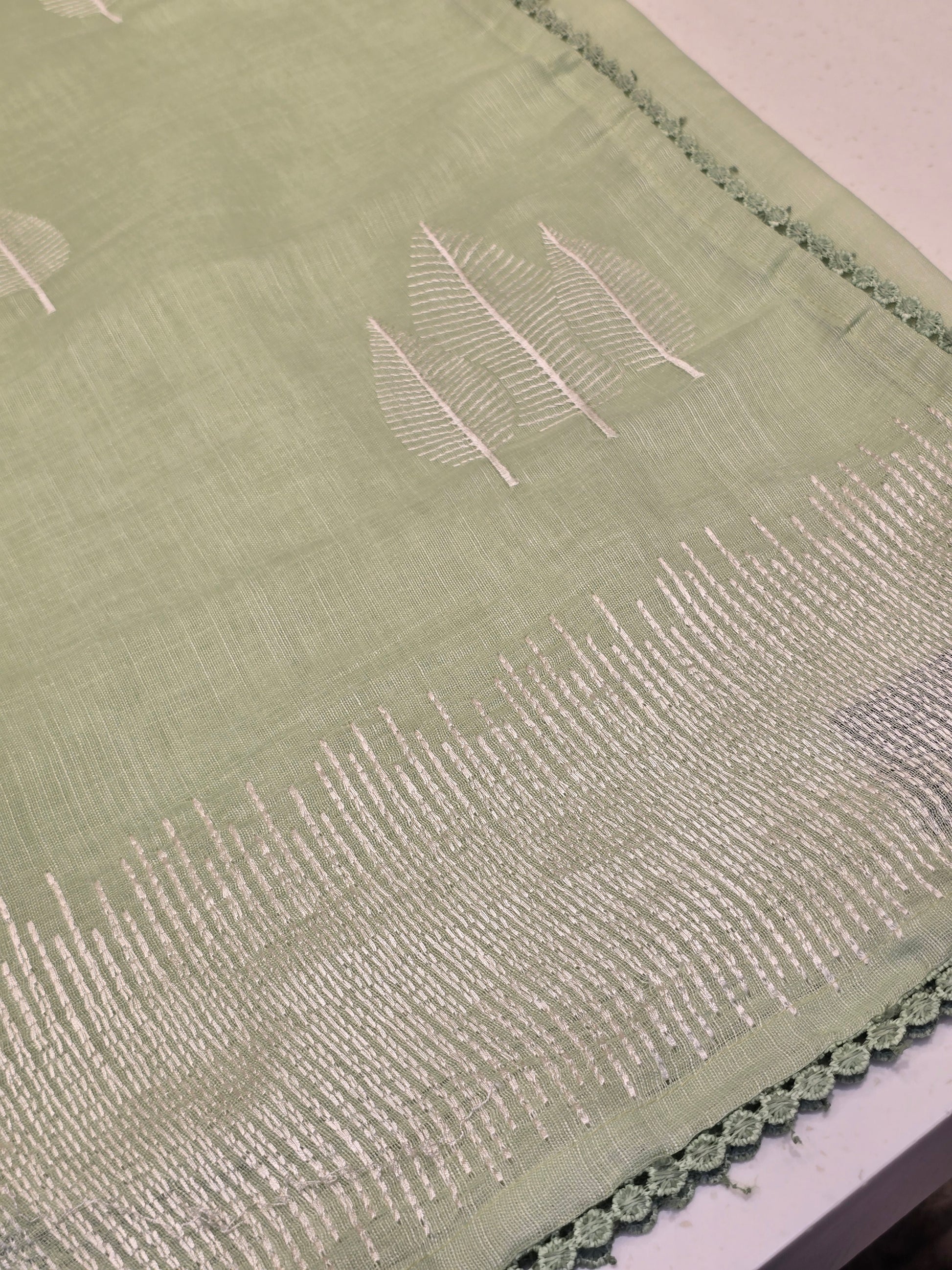 Material composition: Lenin with embroidery border and leaf motif lightweighted saree