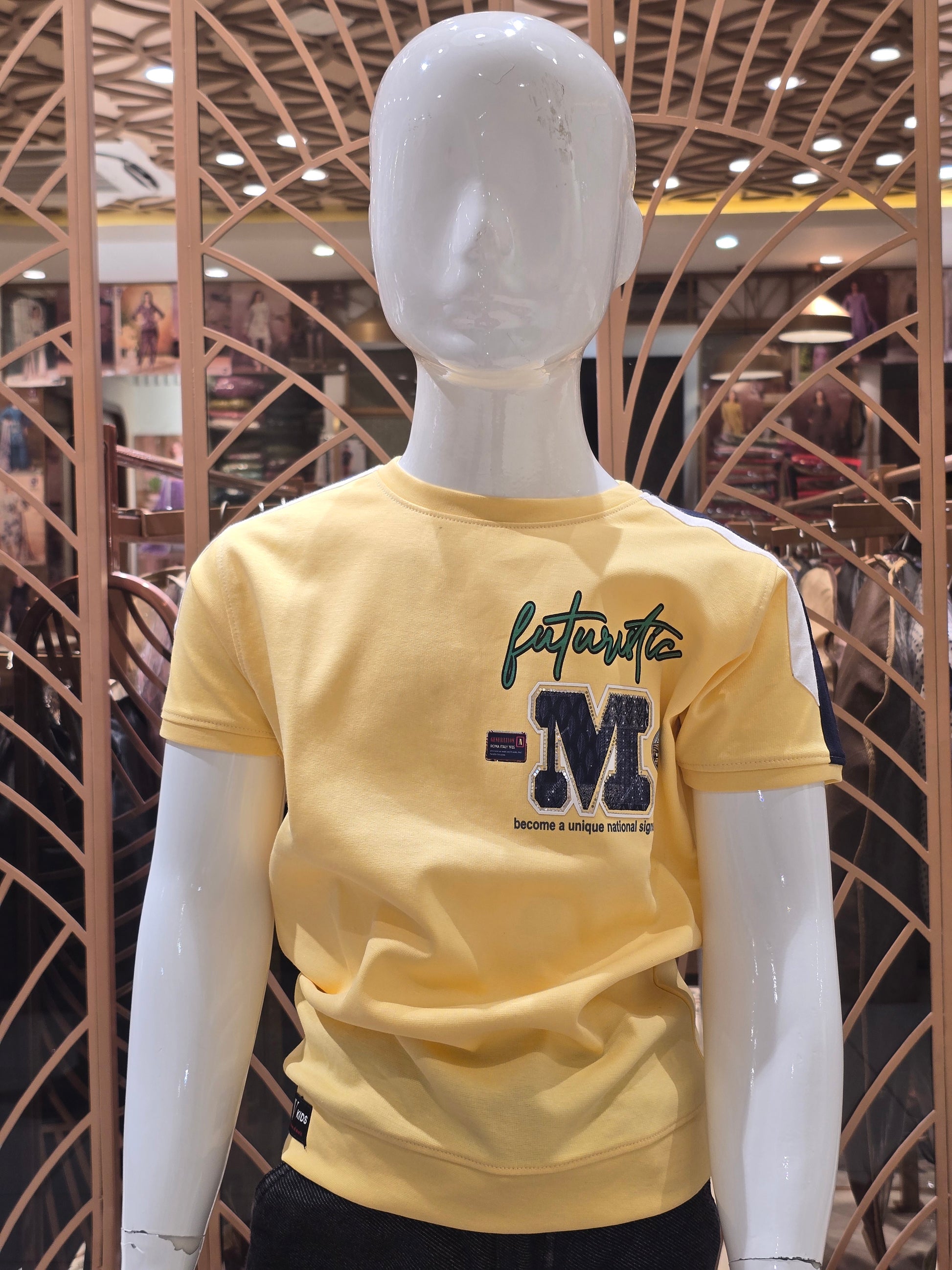 Crafted in soft lycra fabric, this lemon yellow t-shirt offers a comfortable stretchable feel with a vibrant casual look. The rubber print detail adds a modern stylish touch while maintaining everyday comfort. Lightweight and breathable, it is ideal for outings, playtime, and all-season styling. A bright wardrobe essential designed for active kidswear fashion.