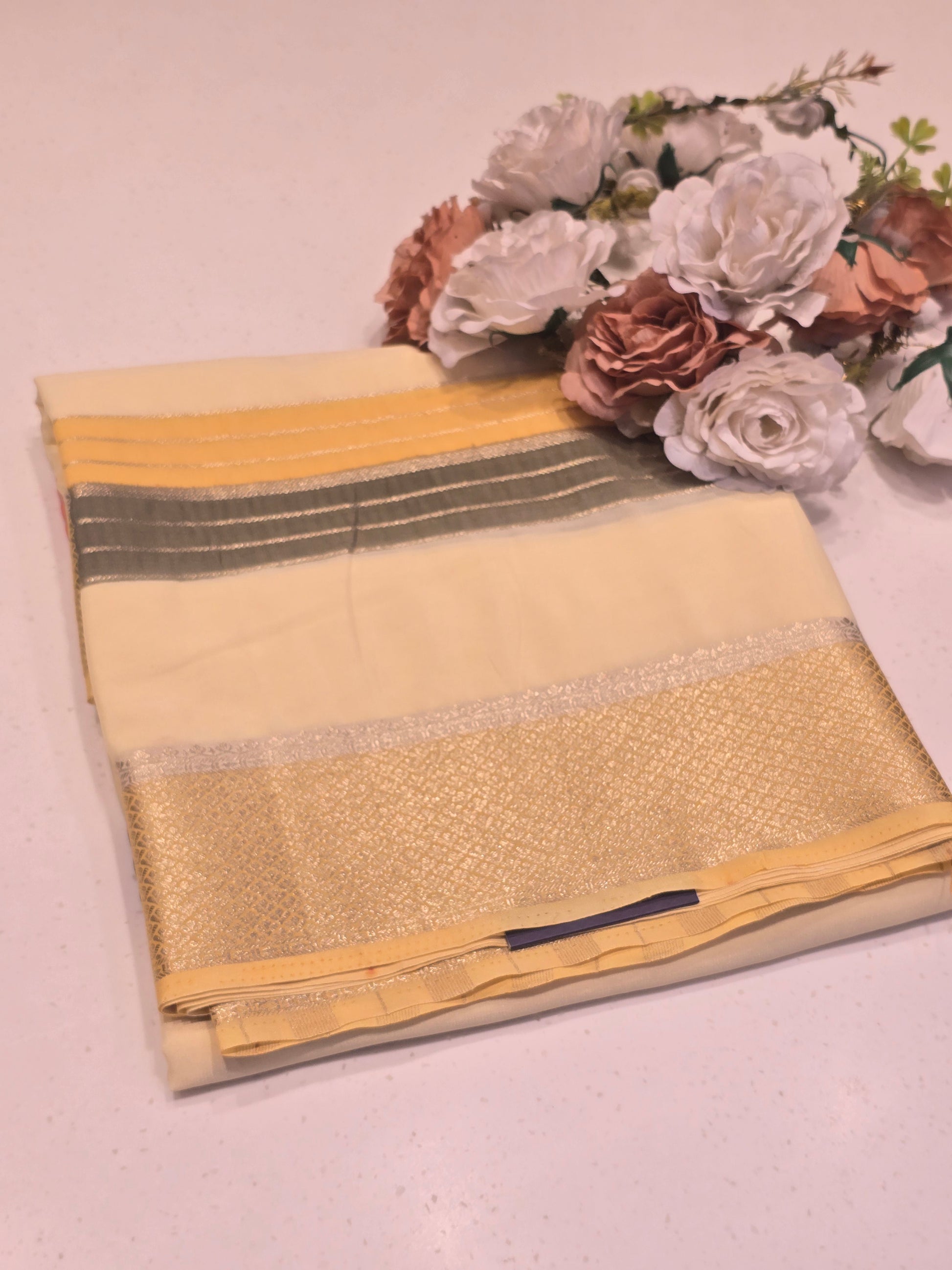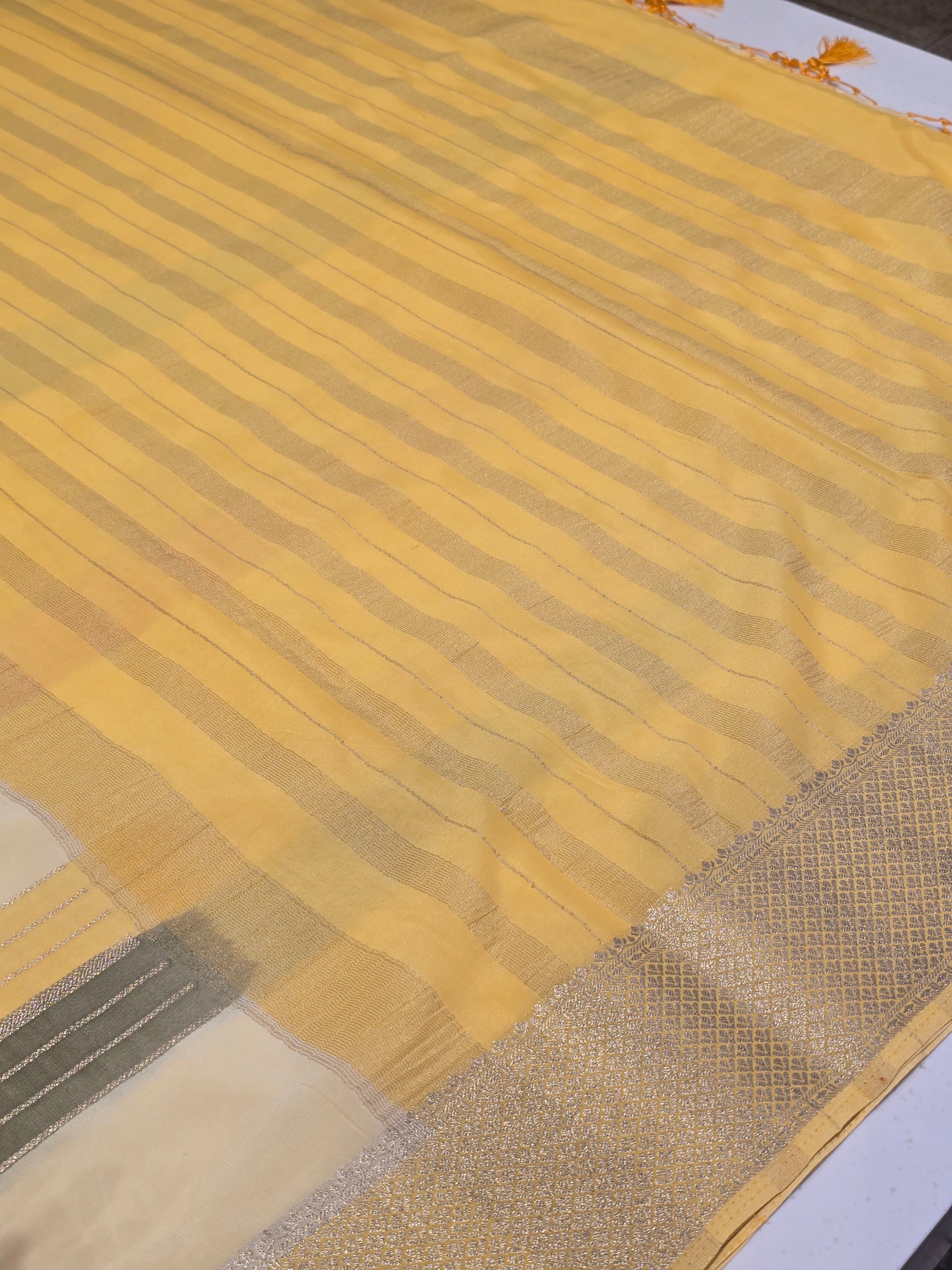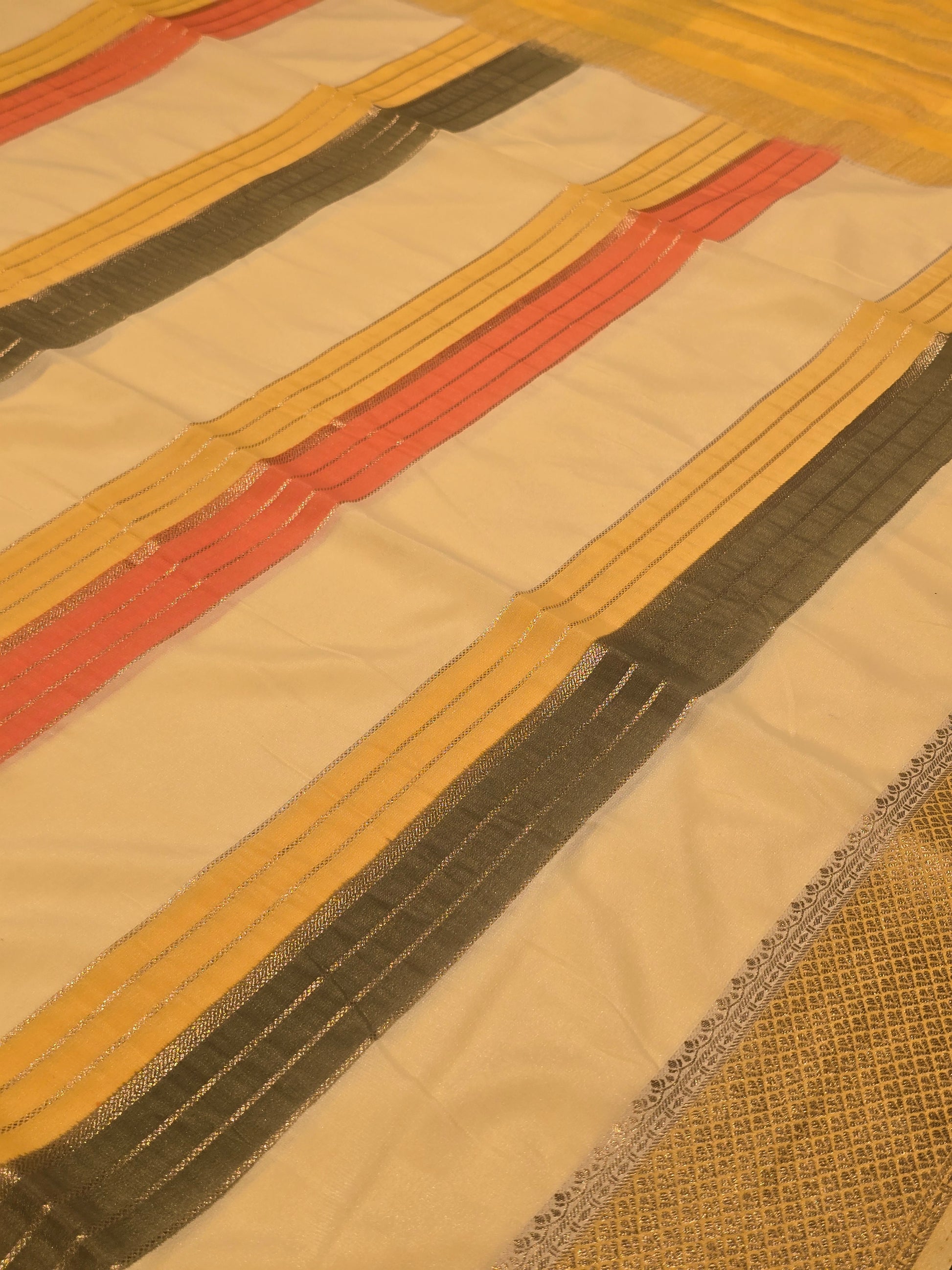 Premium quality multi-color crepe fabric with soft texture, smooth drape and highlighted horizontal lines pattern paired with a traditional kadhi zari pallu for a refined festive touch.