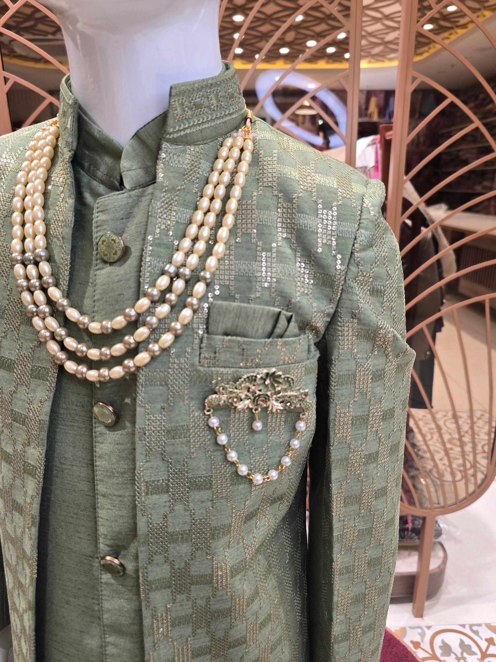 This pista green indo-western set is crafted using a premium silk-mix Jakhad fabric, giving it a rich and traditional look perfect for weddings, receptions, festivals, and family celebrations. Enhanced with elegant sequin detailing and hand-work brooch, the outfit brings a stylish royal appeal. The highlight is the beautiful 3-layer maala that completes the traditional festive charm. Designed for comfort yet maintaining a luxury appearance, this two-piece set makes an ideal pick for boys who love wearing classy ethnic wear with a modern touch.