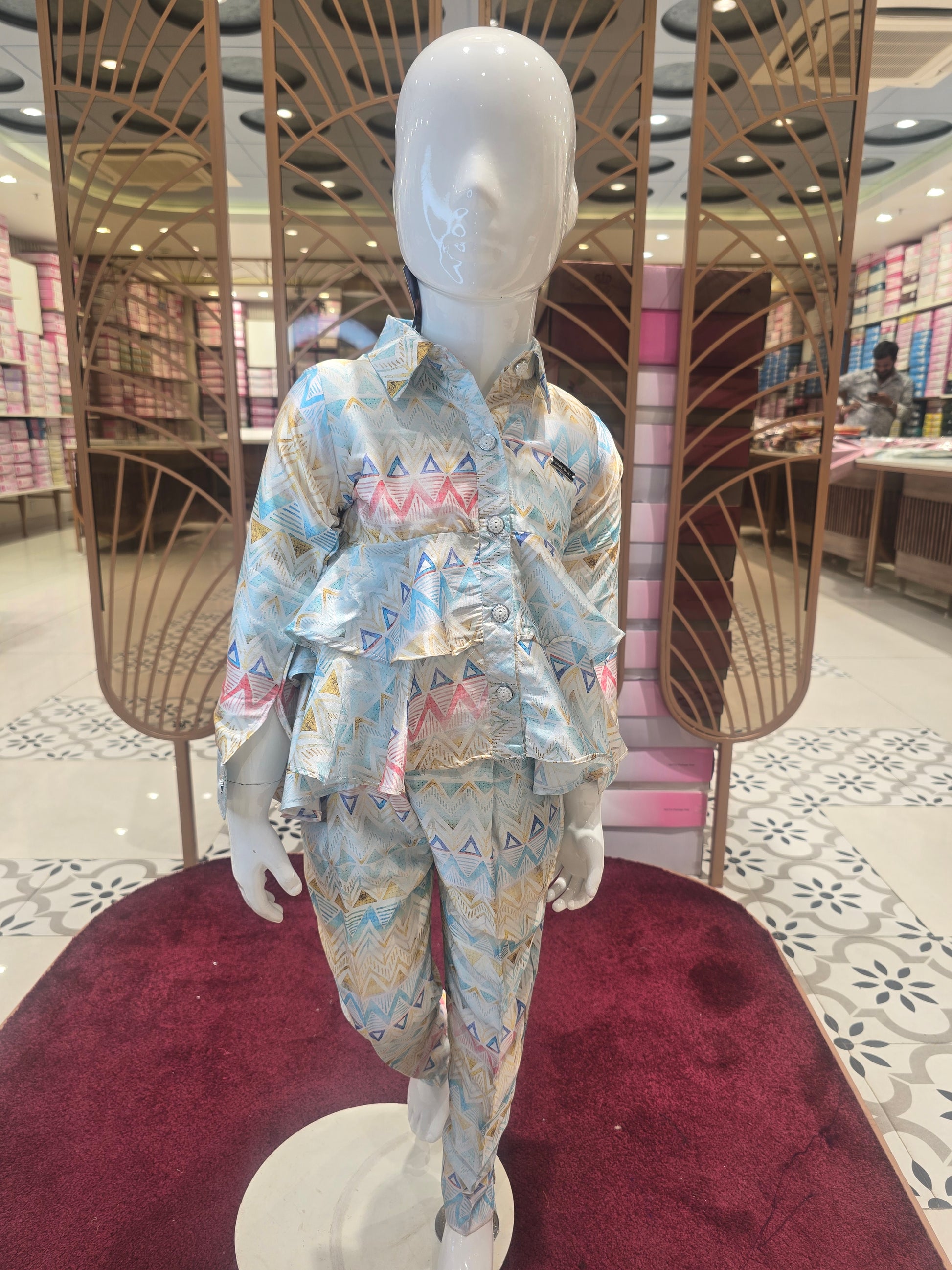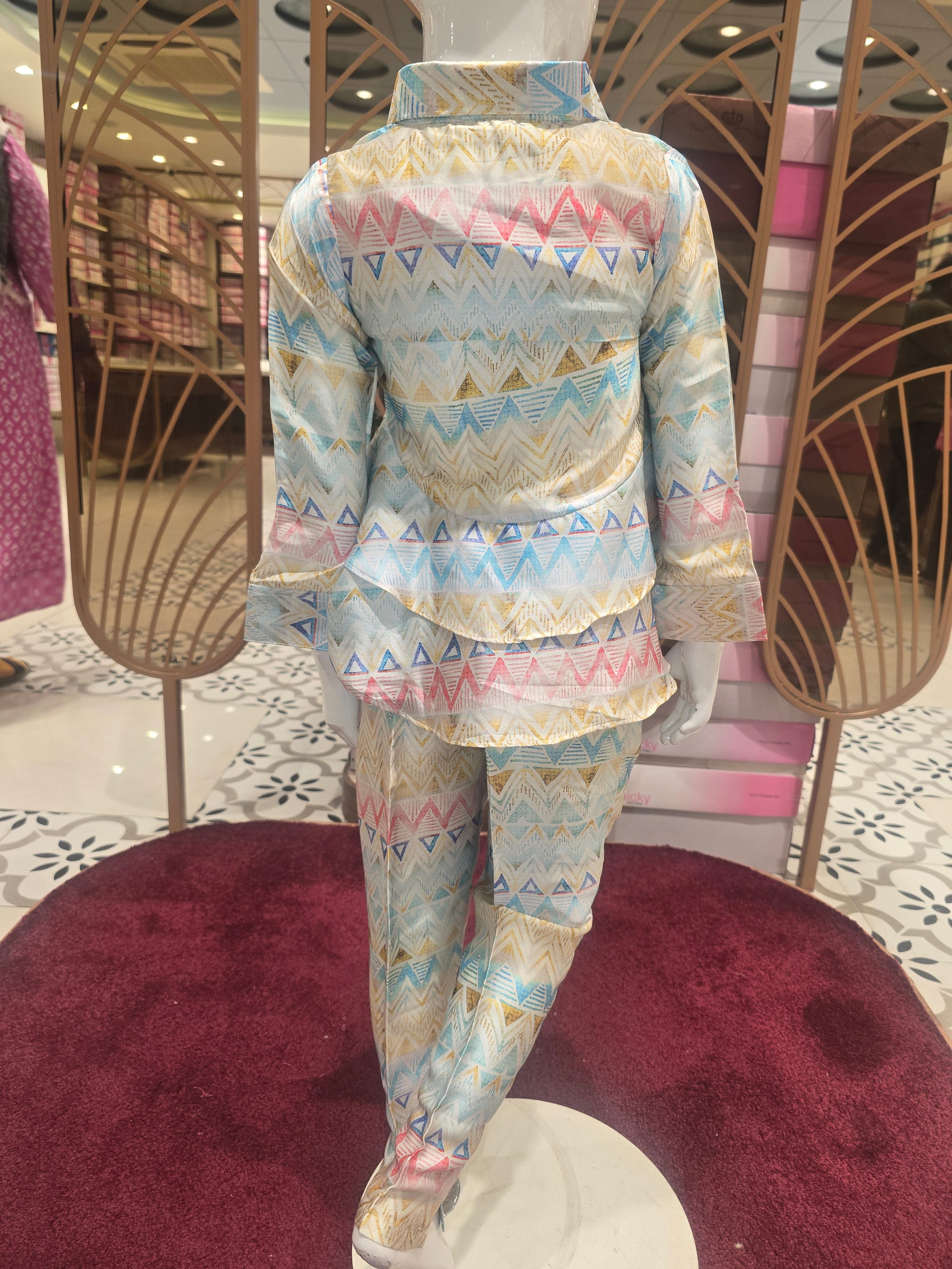 This girls printed satin western set is crafted from smooth satin fabric that offers a soft sheen and elegant fall. Designed with a front-open collared top paired with straight-fit pants, it delivers a smart and contemporary silhouette. Lightweight and comfortable for summer wear, this western pant set is ideal for parties, outings, and stylish everyday occasions.