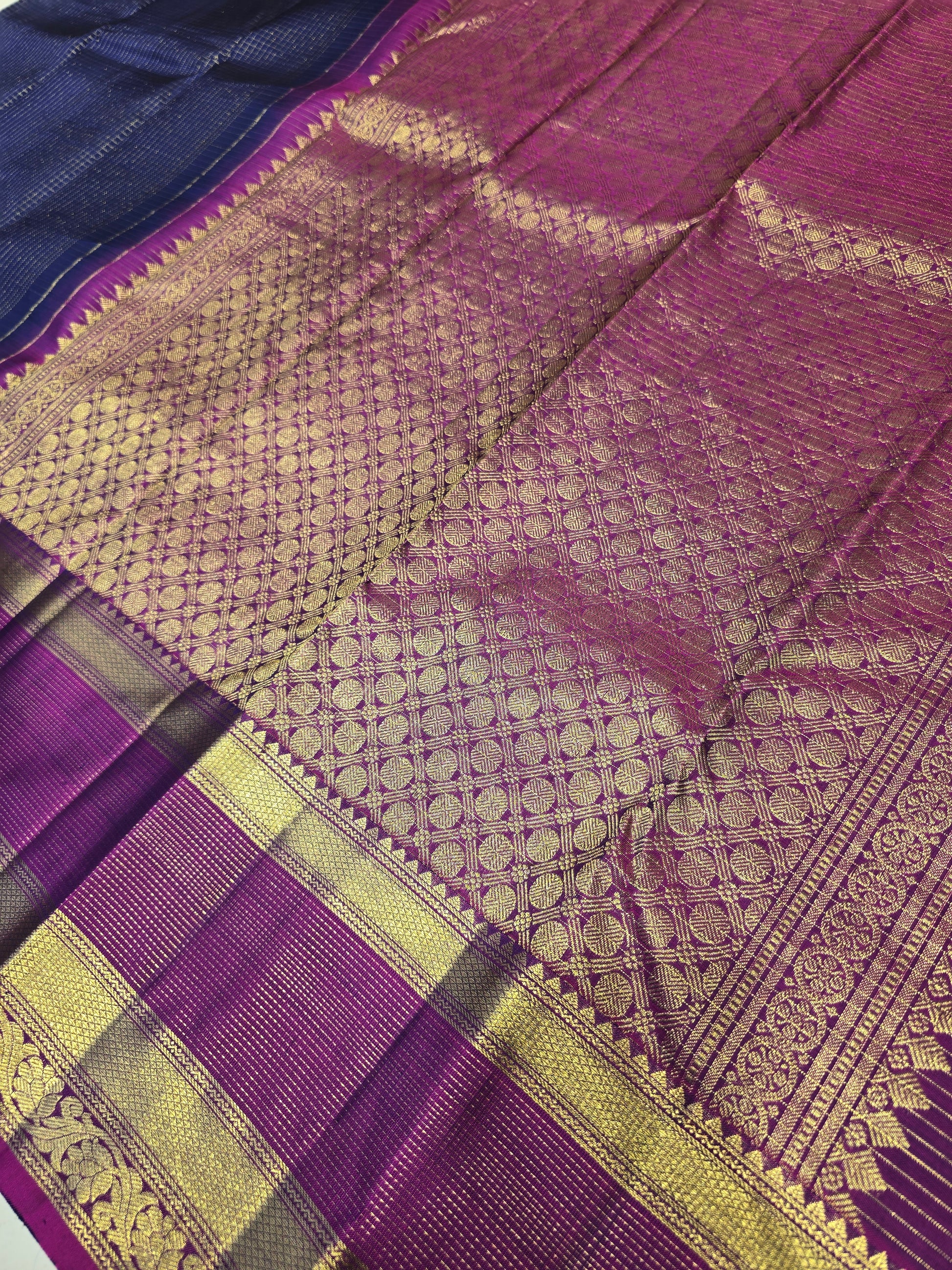 This Pure Kanchipuram Handloom Silk Saree brings together traditional artistry and modern elegance in every detail. The body features a delicate small-checked weaving pattern that adds richness without overwhelming the look. The contrast Bantex zari border and the beautifully detailed pallu complete the saree with a luxurious finish. Its soft drape, vibrant shades, and premium texture make it a timeless choice for special occasions.