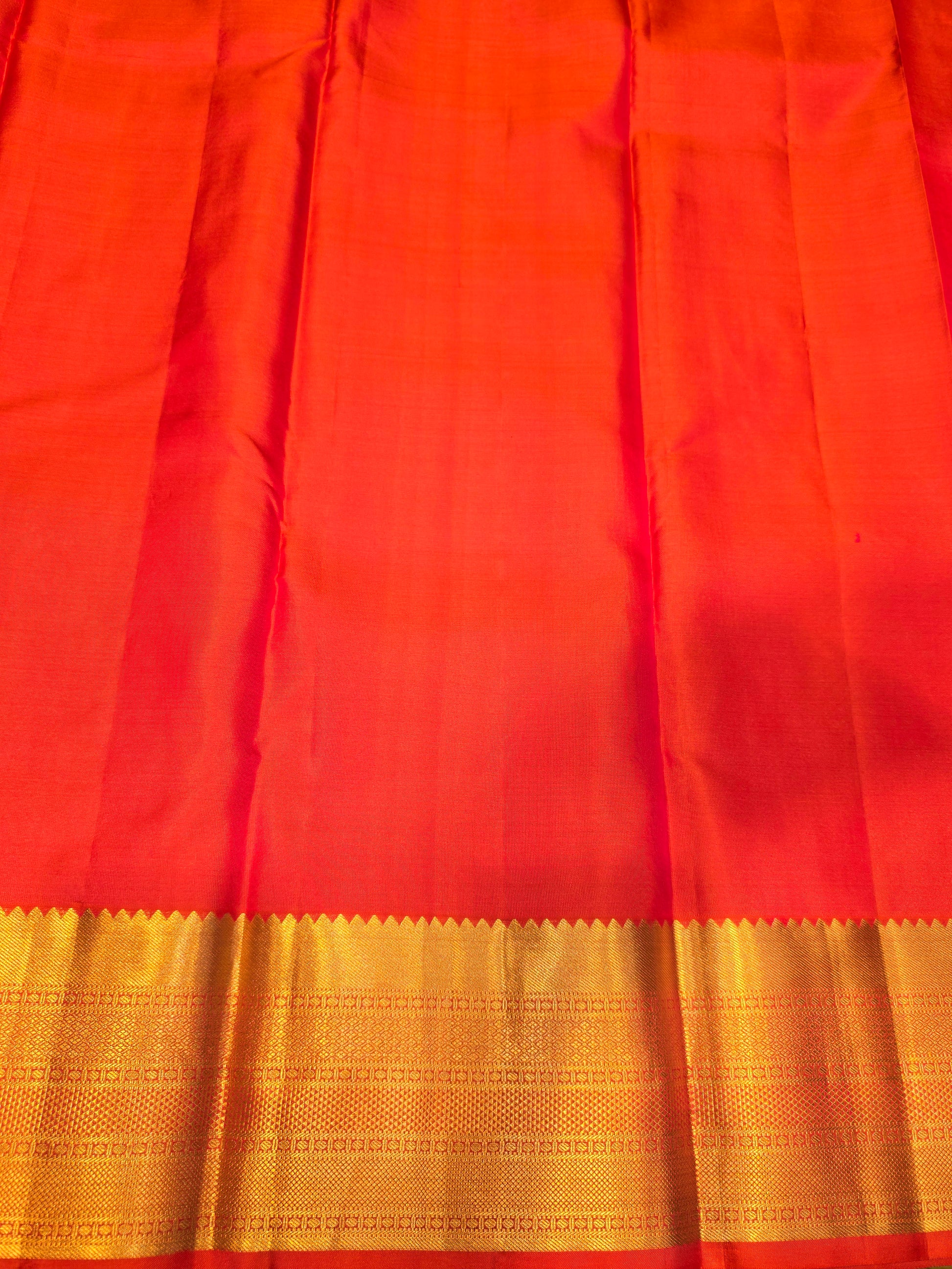 This pure Kanjivaram silk saree comes in a striking rani pink shade with a vibrant orange contrast, woven from rich handloom silk for a luxurious drape. The saree features elegant silver designer work highlighted with gold leaf motifs, complemented by a classic gatti border and a richly detailed pallu. Regal in appearance and timeless in appeal, it is an ideal choice for festive occasions, weddings, and traditional celebrations.