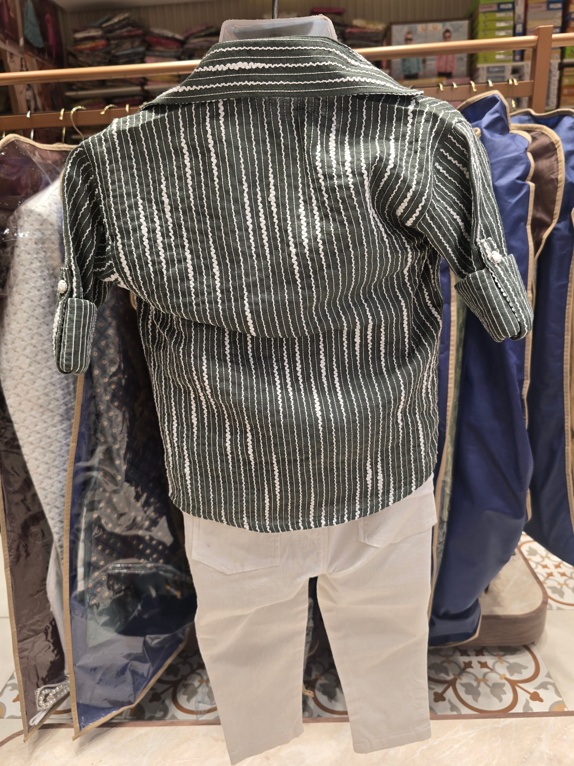 This stylish boys 3 piece summer wear set is designed to deliver a refined and modern look with a touch of elegance. The set features a smart coat detailed with vertical thread work design, paired with a classic white lenin pant and a printed t-shirt for a well-coordinated outfit. Crafted for comfort and ease of movement, this outfit is ideal for summer wear, festive occasions, family functions, and special gatherings, offering a perfect balance of comfort, sophistication, and contemporary kidswear styling for young boys.