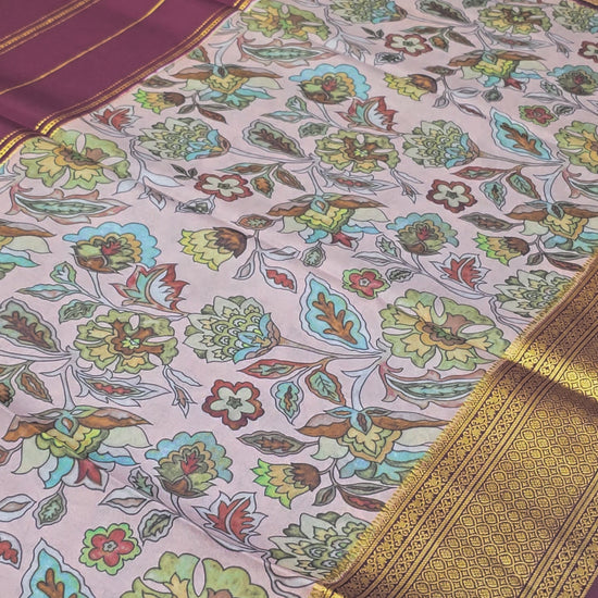 This exclusive Pure Mysore Kalamkari Crepe Silk Saree features a beautifully printed baby-pink base adorned with detailed Kalamkari floral artwork. The body comes in an elegant chocolate brown shade, enhanced further with a traditional Gatti Zari Border that adds richness and definition to the entire drape. The combination of Kalamkari prints and smooth Mysore crepe silk creates a lightweight, flowy saree with a luxurious natural sheen.