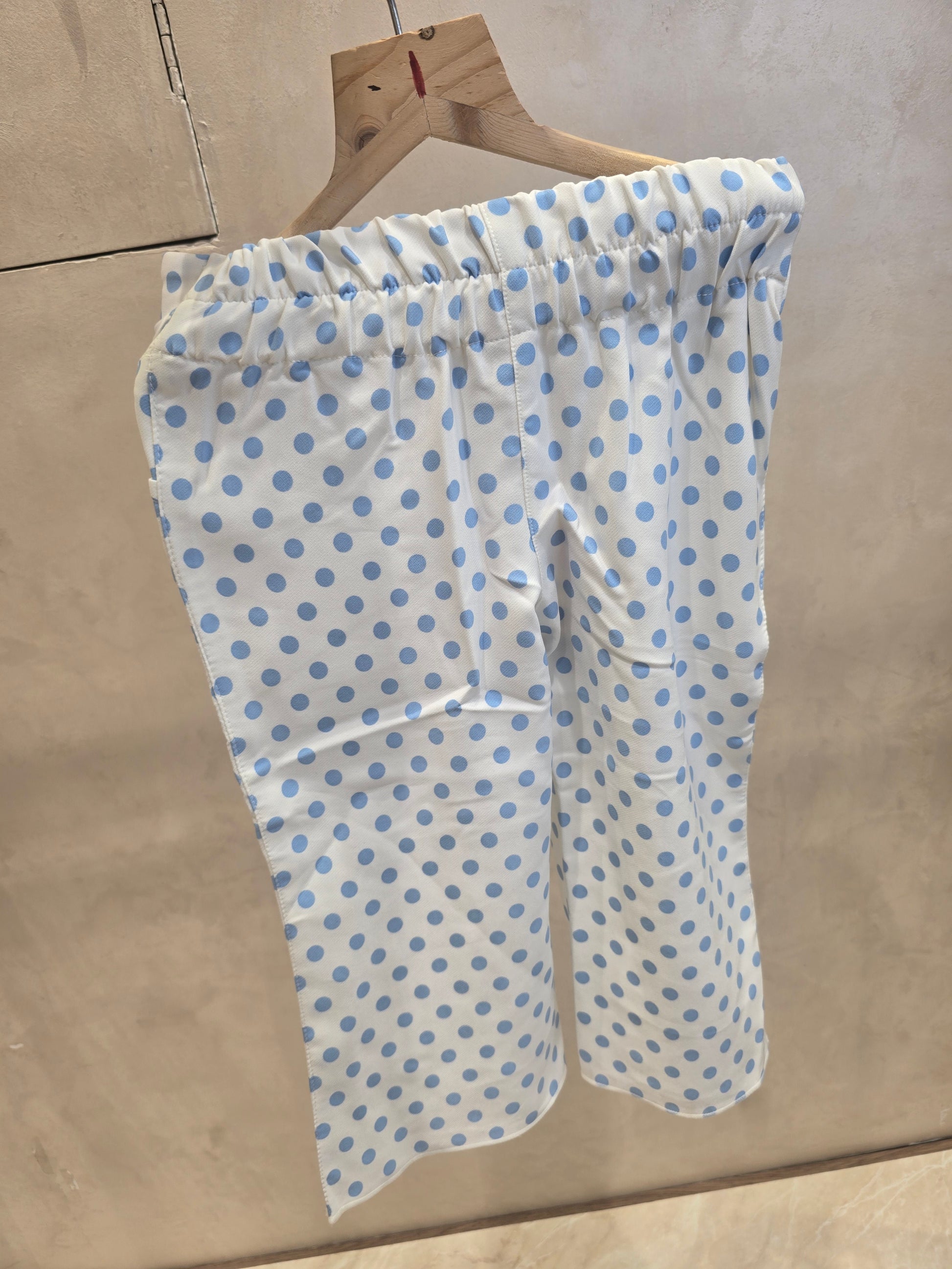 Color: White base with sky blue polka dots