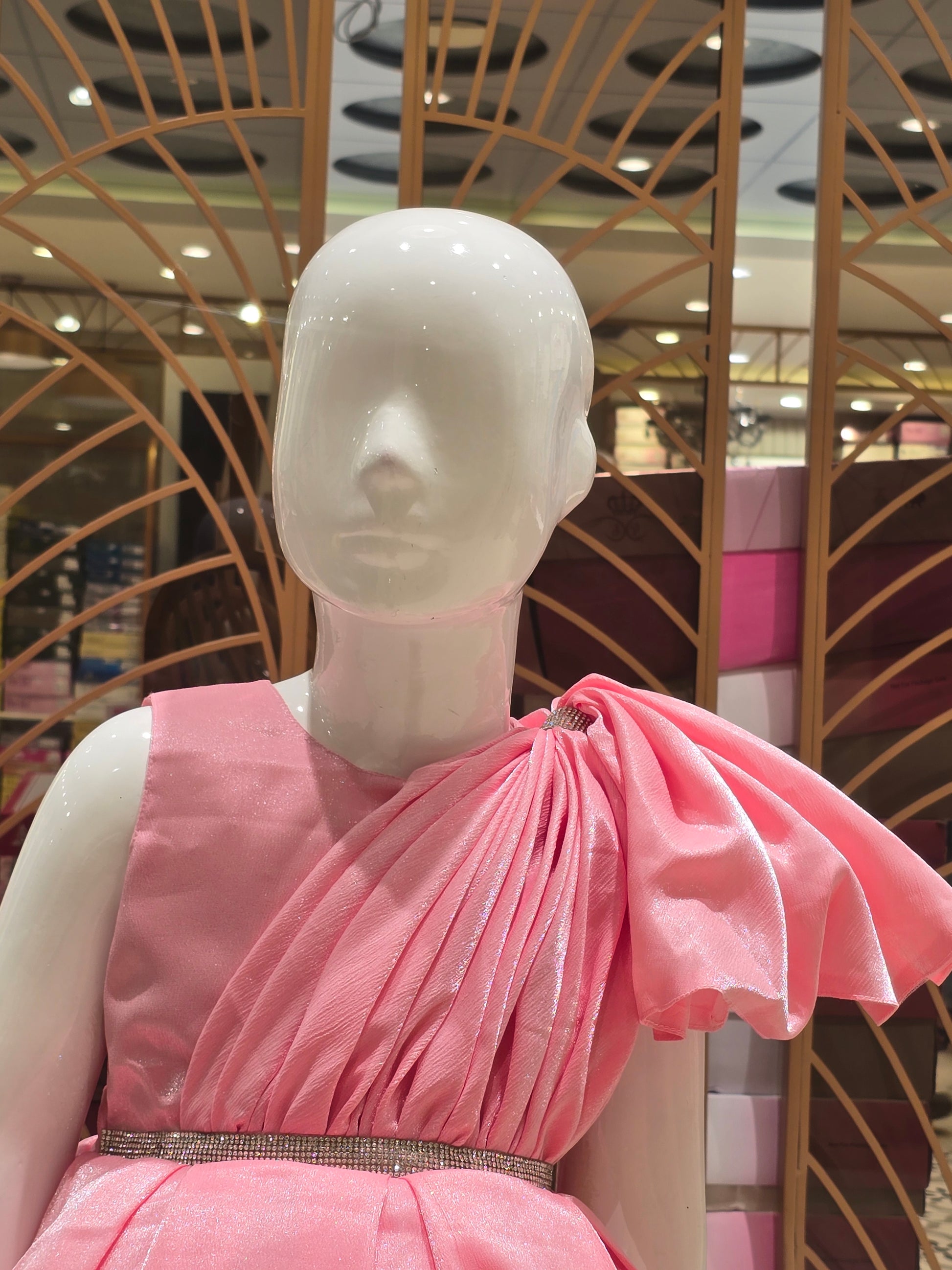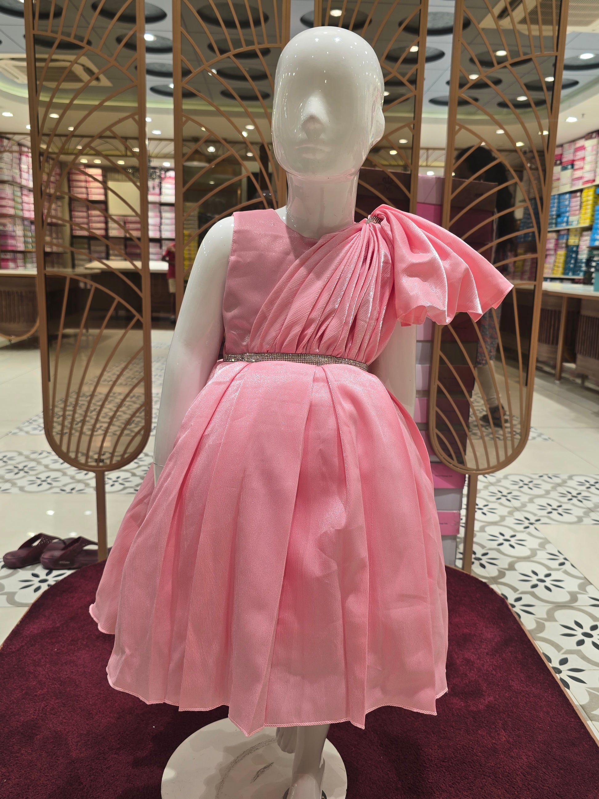 This peach party wear short frock is crafted from smooth satin crepe fabric, offering a soft sheen and comfortable feel for little ones. Designed with a stylish wavy open sleeve detail on the left shoulder, it is beautifully enhanced with a stone-embellished waist belt for a festive touch. Lightweight and elegant, this frock is perfect for birthdays, parties, and special celebrations.