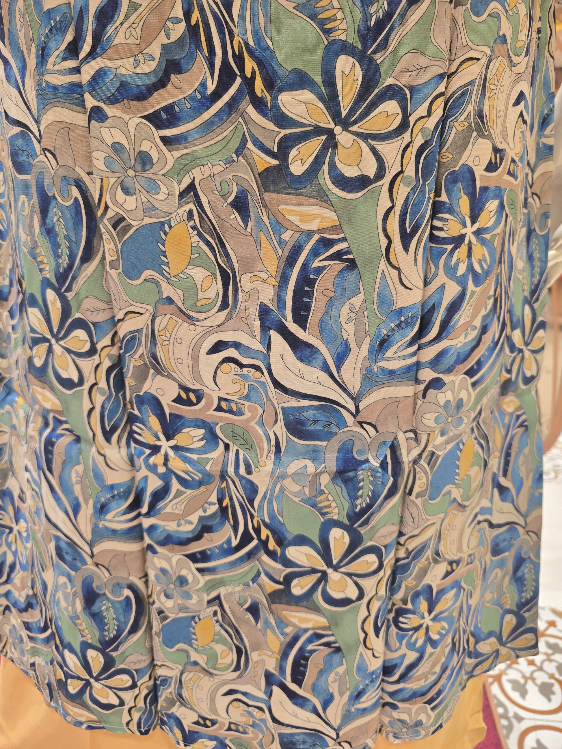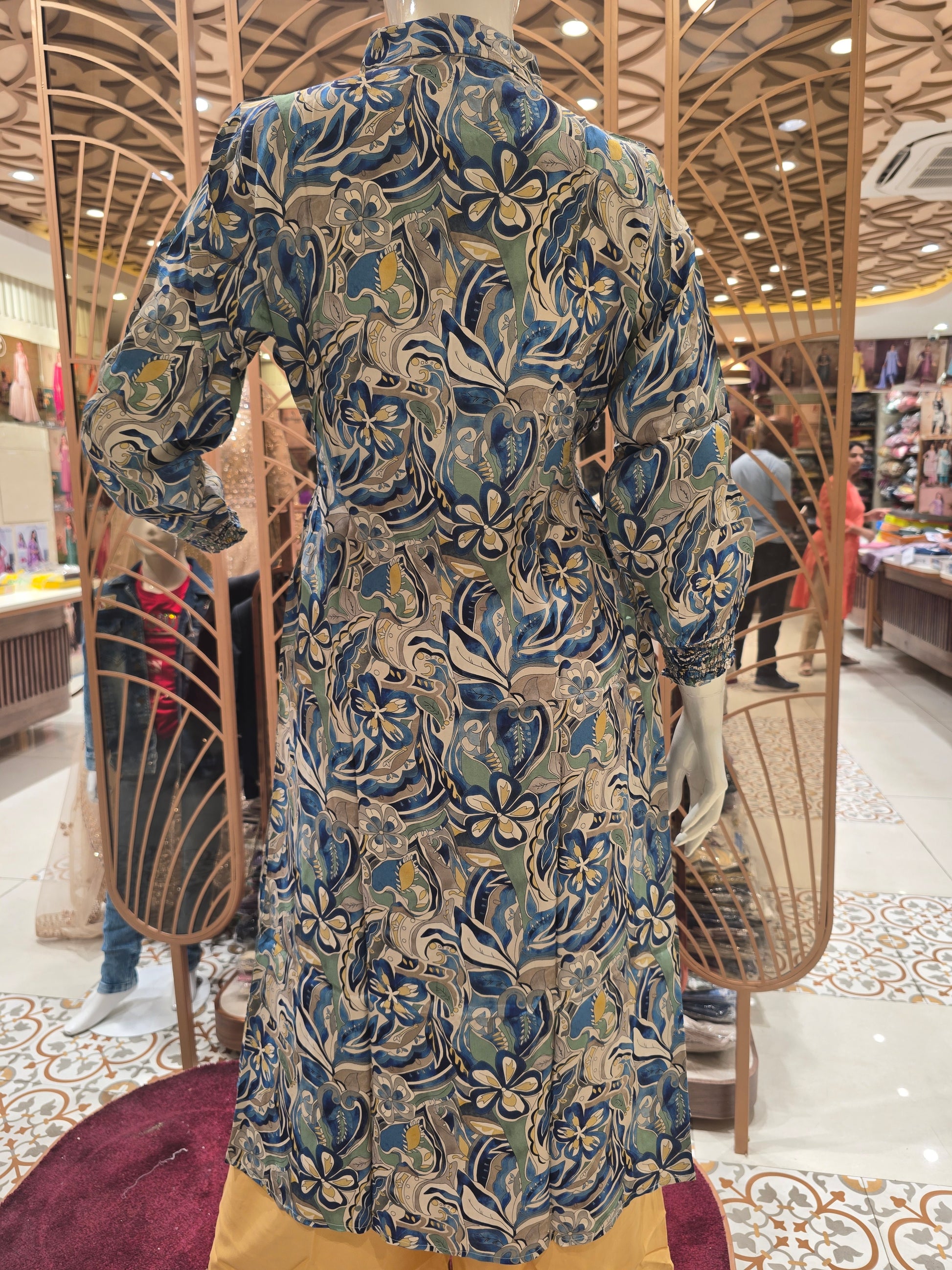This women’s top features vibrant multi-colour digital prints that bring a lively touch to everyday dressing. Designed in a straight fit with a smart collared neckline and three-quarter sleeves, it offers a balanced blend of comfort and style. Lightweight and easy to pair, this top is ideal for casual outings, office wear, and daily use.