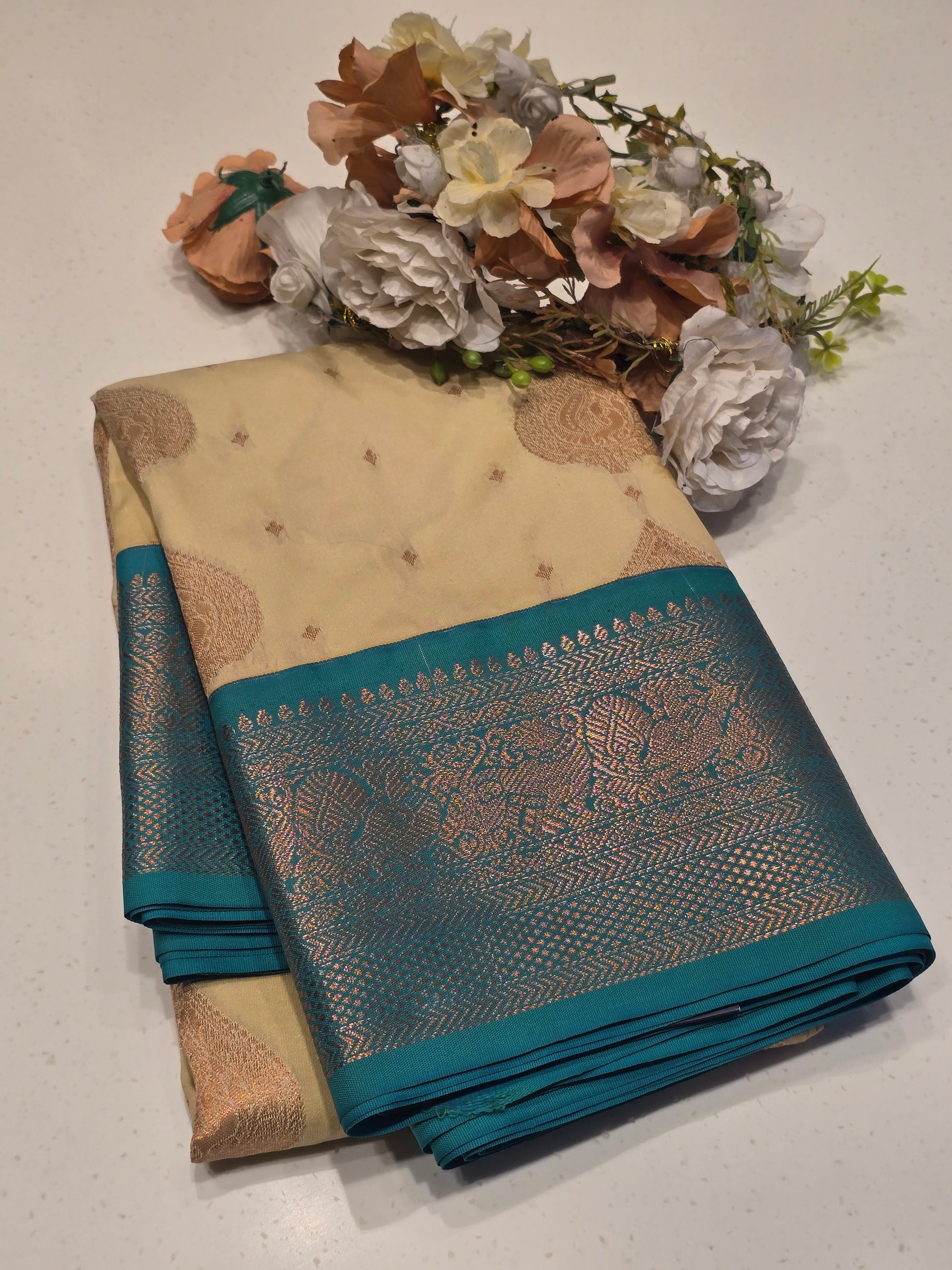 Semi Kanjivaram muhurtham saree with leaf styled vertical motifs & small butta with rich pallu , traditional border