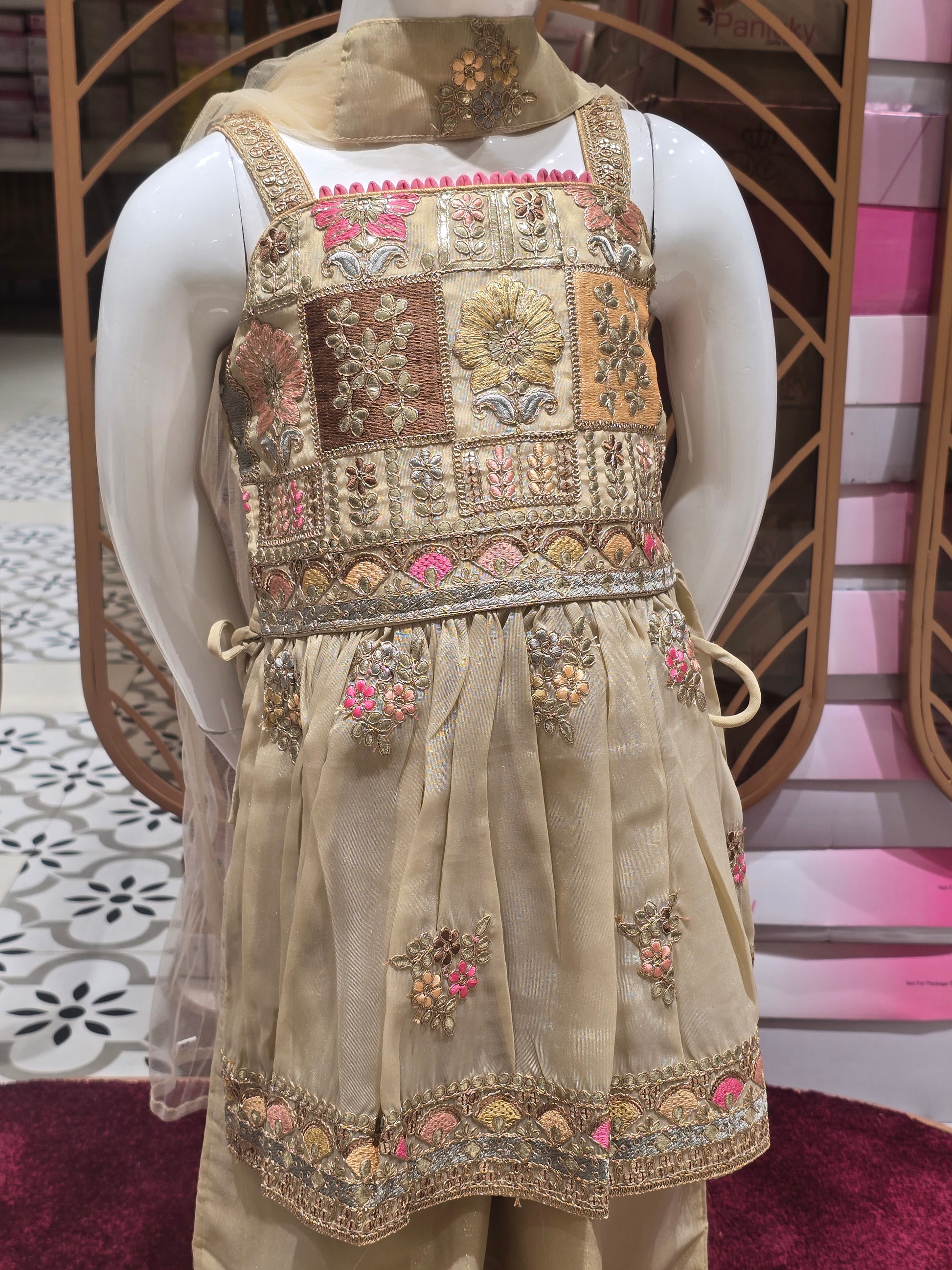 Girls Cream Tissue Sharara Set with Umbrella Slit Design
