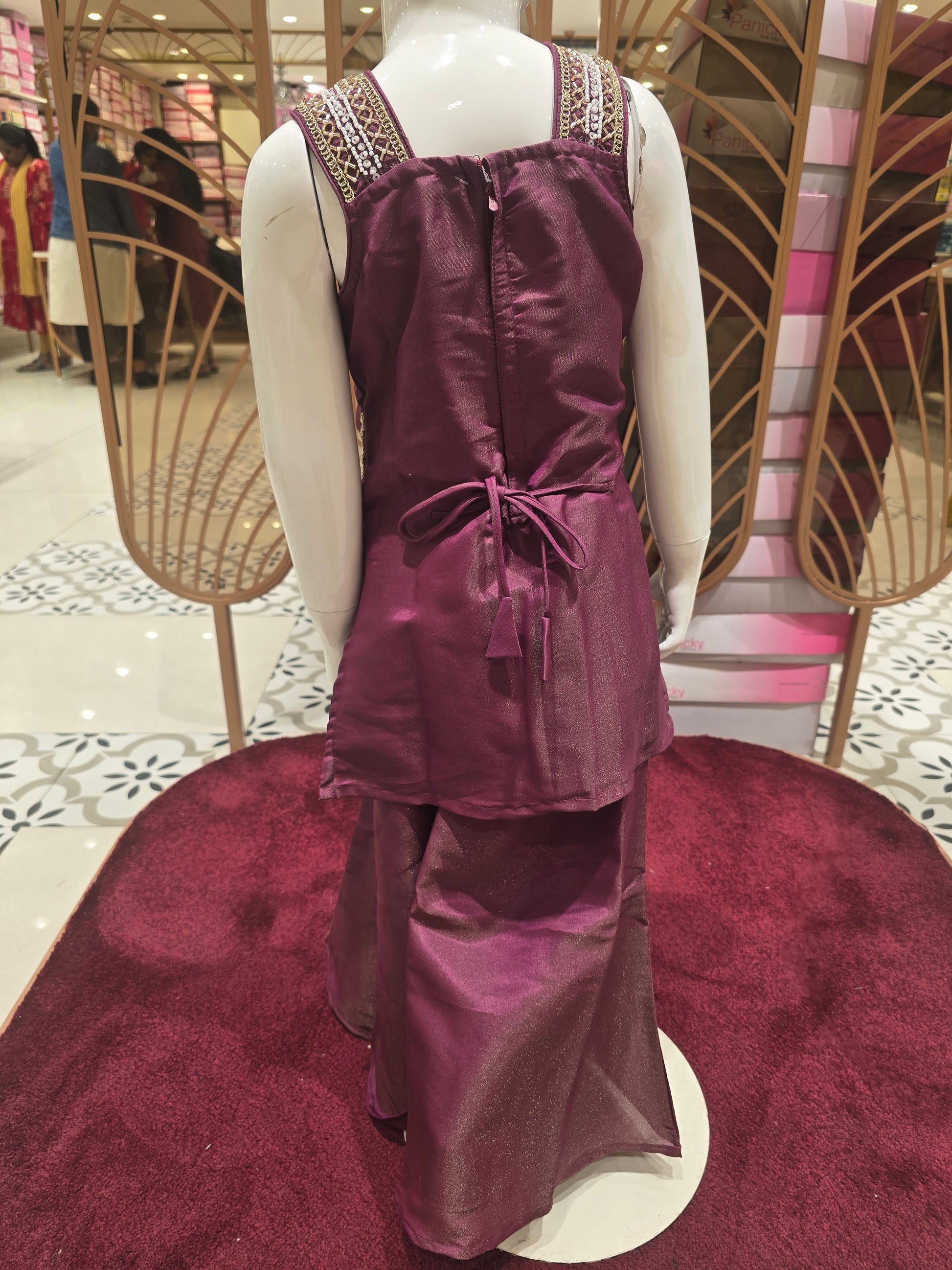 Girls Wine Dual Shade Tissue Sharara Set with Multicolour Embroidery