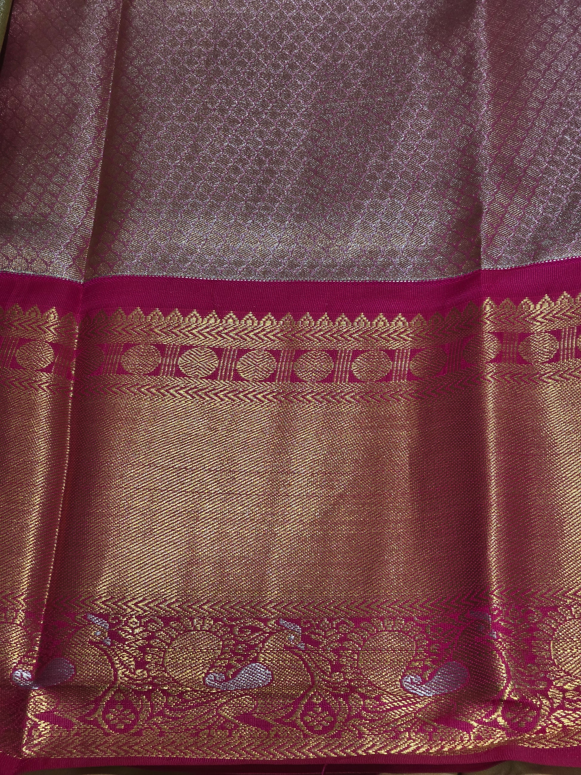 This semi-stitched half saree set is crafted from elegant tissue silk, offering a graceful sheen and traditional appeal. The pleated lehanga is paired with a classic blouse and complemented by a rich soft silk dupatta featuring a long traditional finish. Designed for comfort and festive elegance, this set is ideal for weddings, functions, and cultural celebrations.