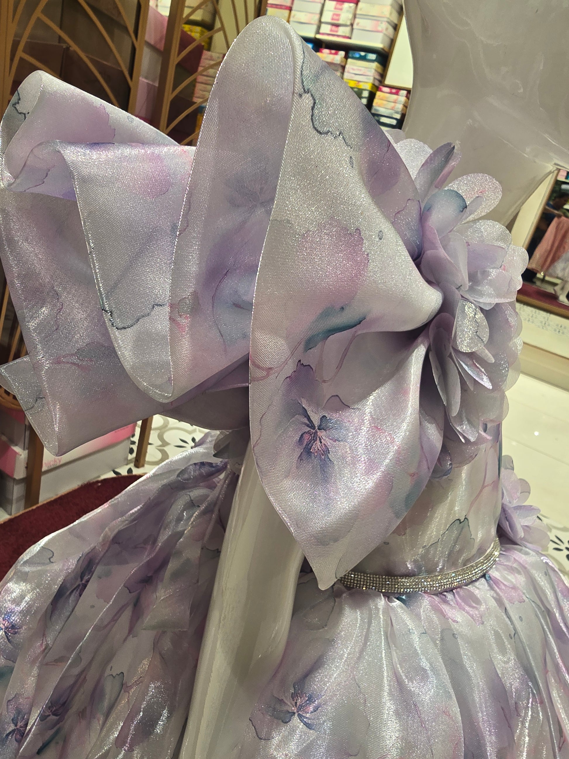 This party wear short frock is crafted from lightweight tissue organza with elegant floral prints spread across the body. Designed with an eye-catching asymmetrical style, it features a delicate spaghetti strap on the left side and a stylish wavy sleeve on the right for a modern festive look. Airy and comfortable, this frock is perfect for birthdays, parties, and special celebrations.