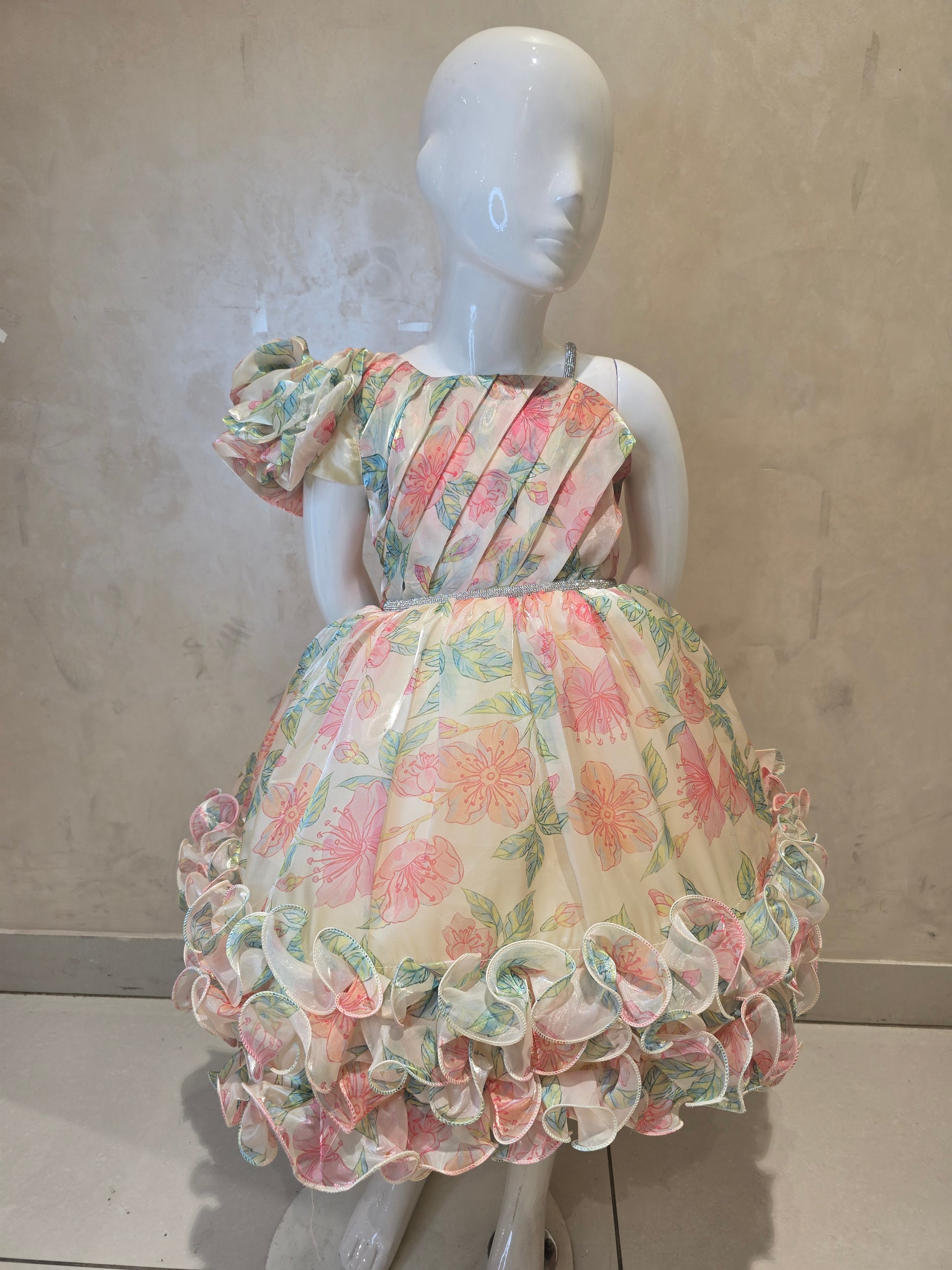 This stylish girls party wear short frock crafted in printed tissue satin material is designed to bring playful elegance to special occasions. Featuring delicate floral prints with a neatly pleated bottom, the frock stands out with its unique asymmetric styling, designed with a right-side buff sleeve and left-side speghetti pattern for a modern look. The waist is finished with an attached belt that enhances the overall silhouette while ensuring comfort and ease of movement. Perfect for parties, festive functions, birthdays, and celebrations, this frock blends comfort, contemporary design, and youthful charm effortlessly.