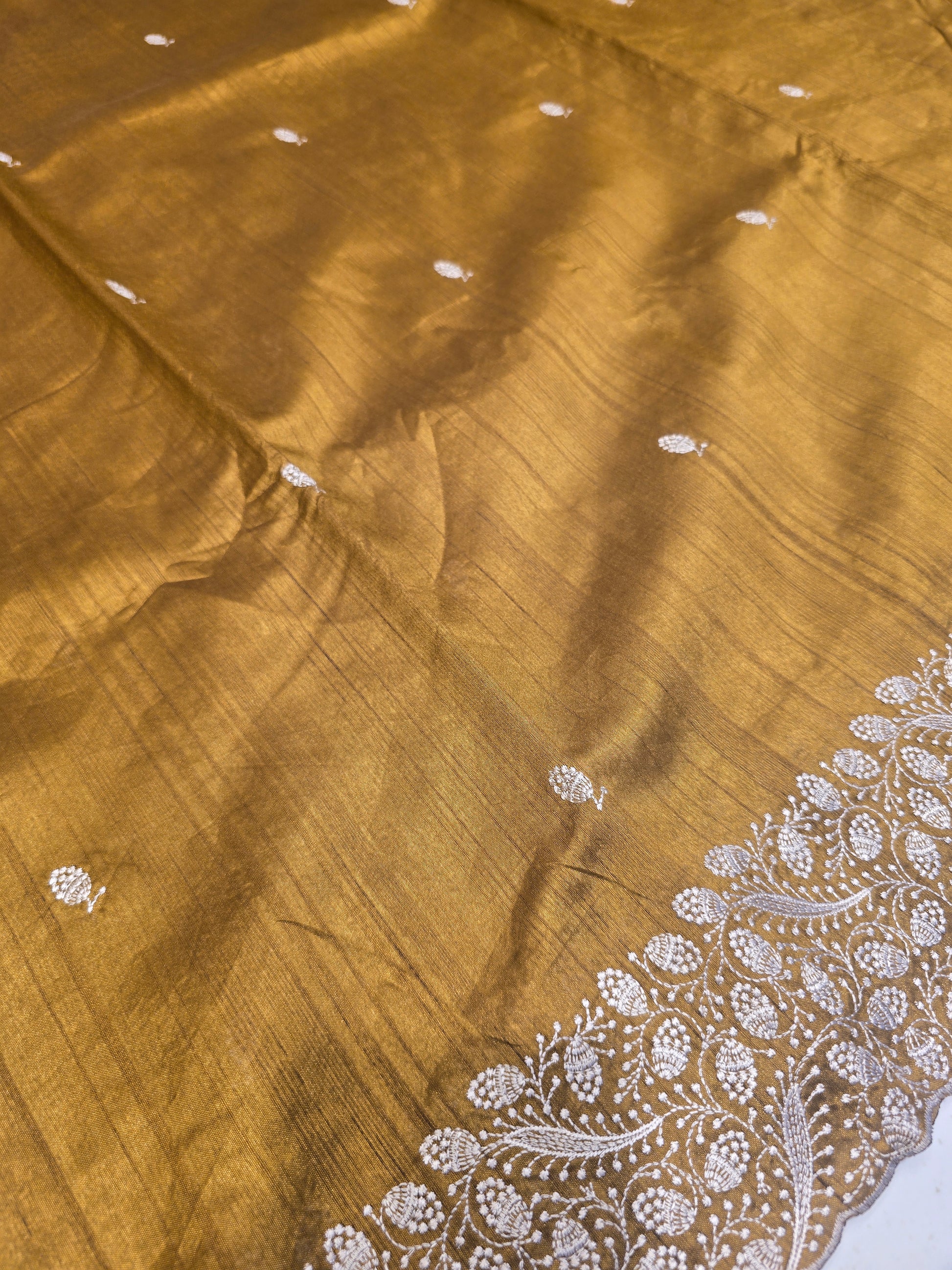 Tussar Silk Saree with Embroidery Motifs and Designer Border | Elegant Soft Drape | Daily & Festive Wear