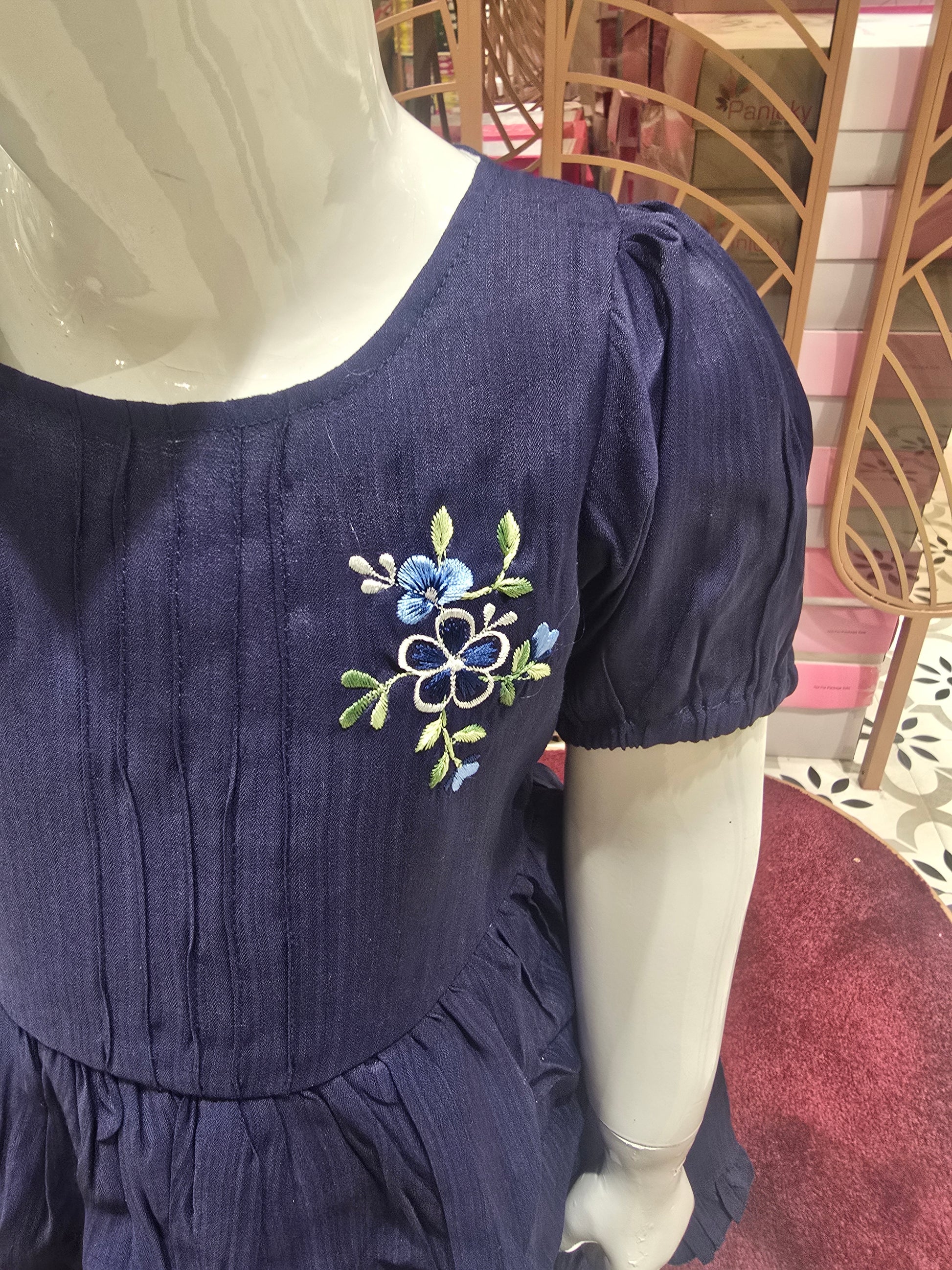 Soft Cotton Navy Blue Short Frock for Girls with Puff Sleeves & Floral Embroidery, Round Neck – Casual Wear