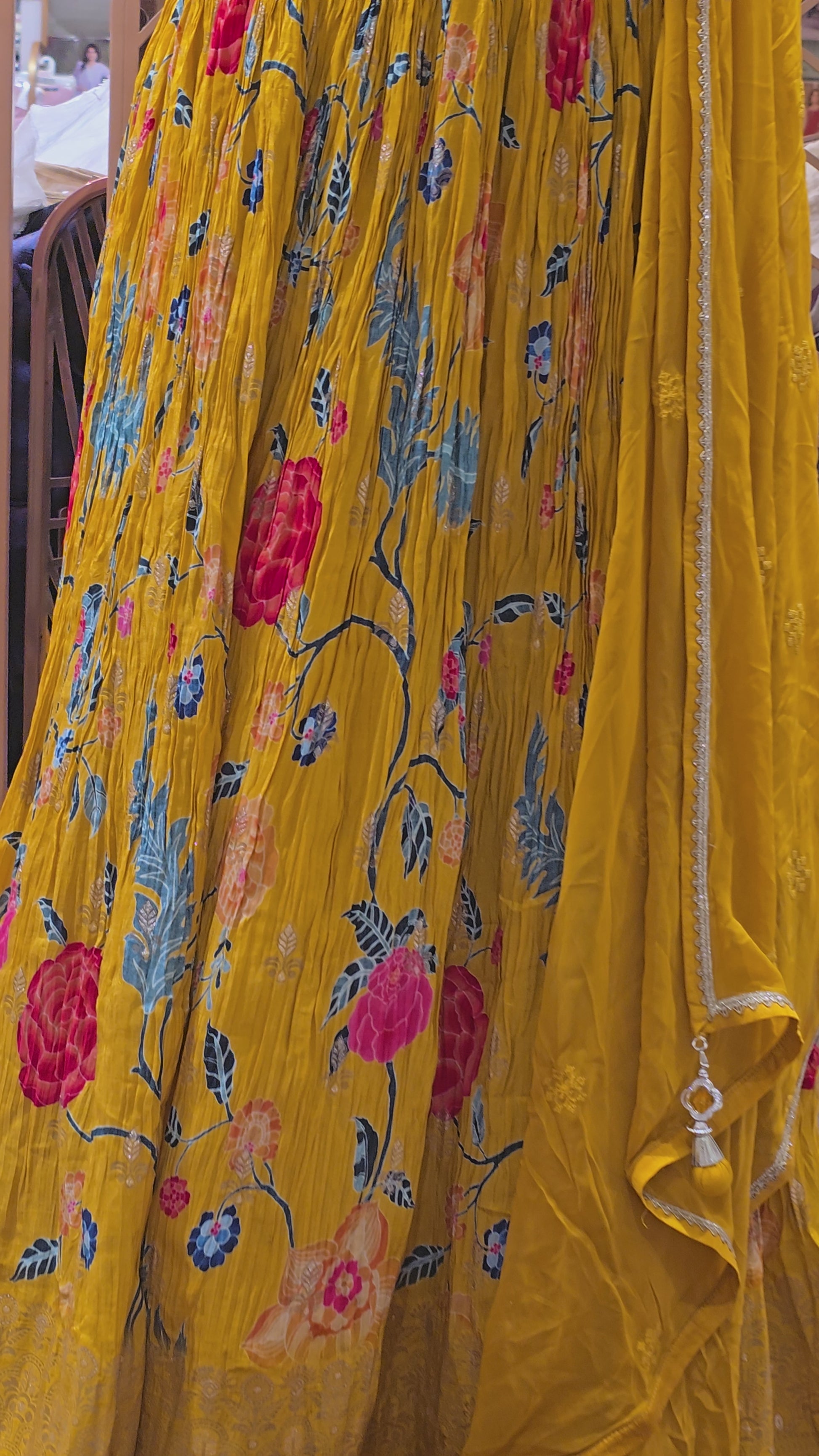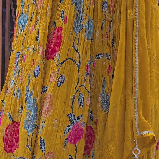 This beautiful mustard Silk Banarasi Lehenga stands out with its rich floral design and delicate handwork that enhances the overall festive charm. The V-neck crop blouse adds a modern touch, while the Banarasi dupatta brings traditional elegance. The flowy skirt with floral motifs ensures a graceful fall, perfect for weddings, haldi ceremonies, sangeet nights, and festive celebrations.