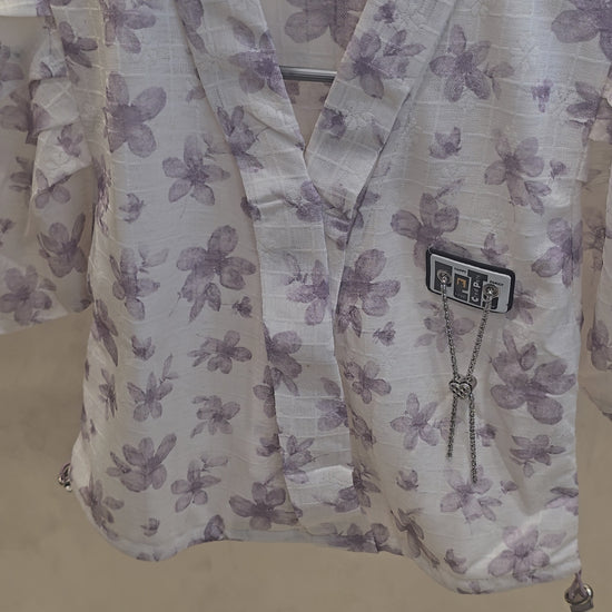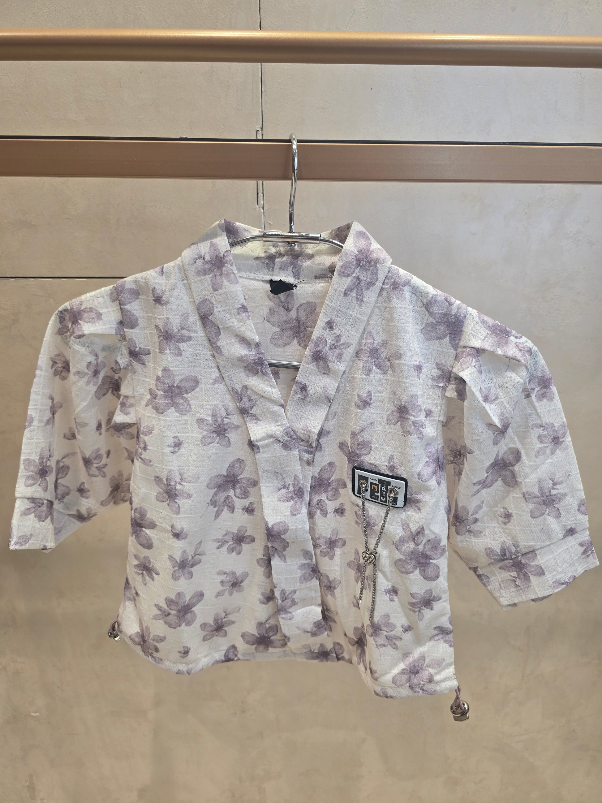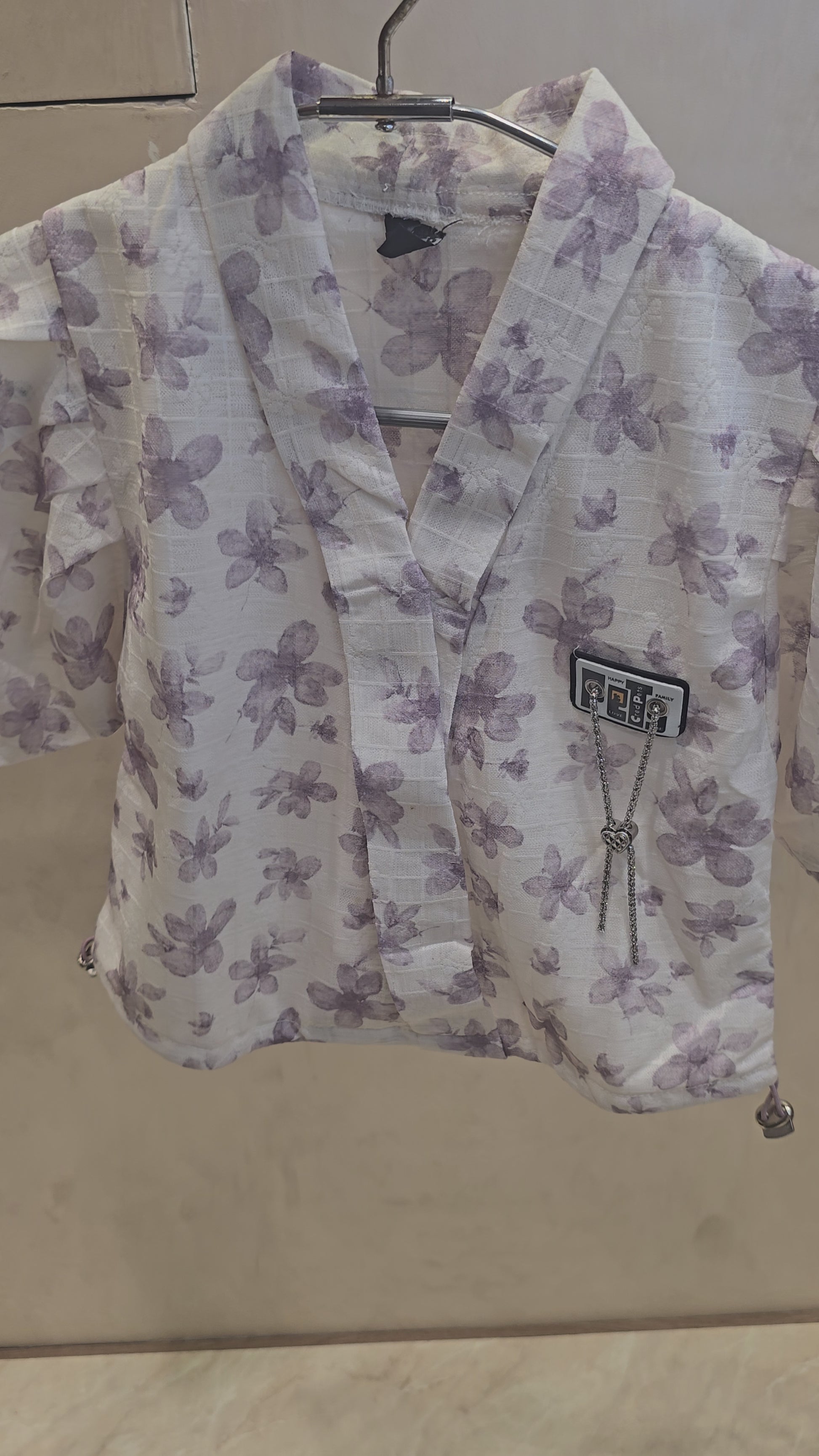 This white base western top is designed in soft crepe fabric with beautiful lavender floral print, making it a stylish and comfortable choice for girls. The buf-sleeve pattern gives a smart and trendy look suitable for everyday wear and casual outings. Crafted from cotton-based material, this top offers breathability and comfort for summer seasons. Ideal for pairing with jeans, skirts, or shorts, it provides a fashionable appearance with ease of movement. A great choice for modern girls looking for lightweight and attractive western wear.