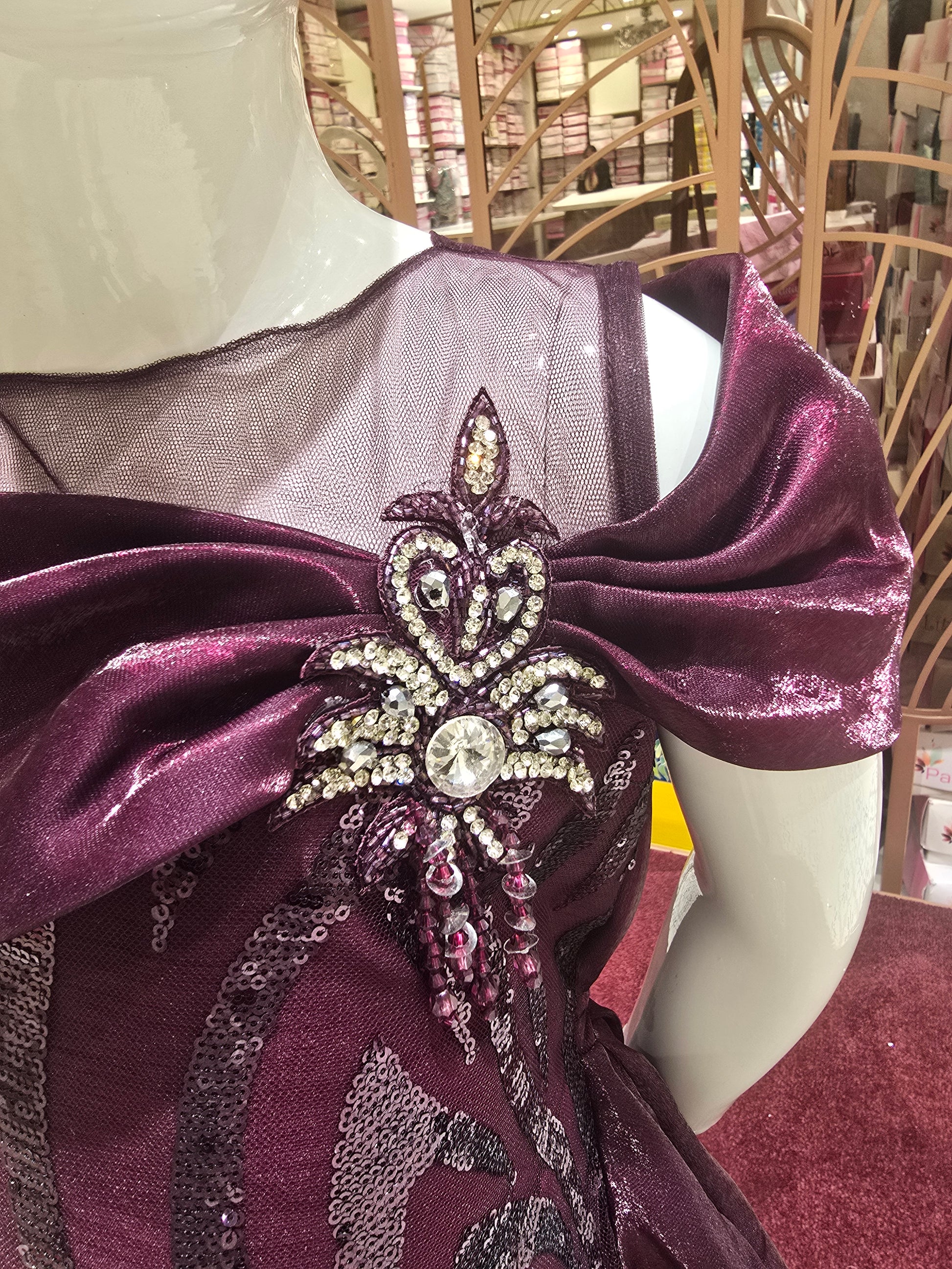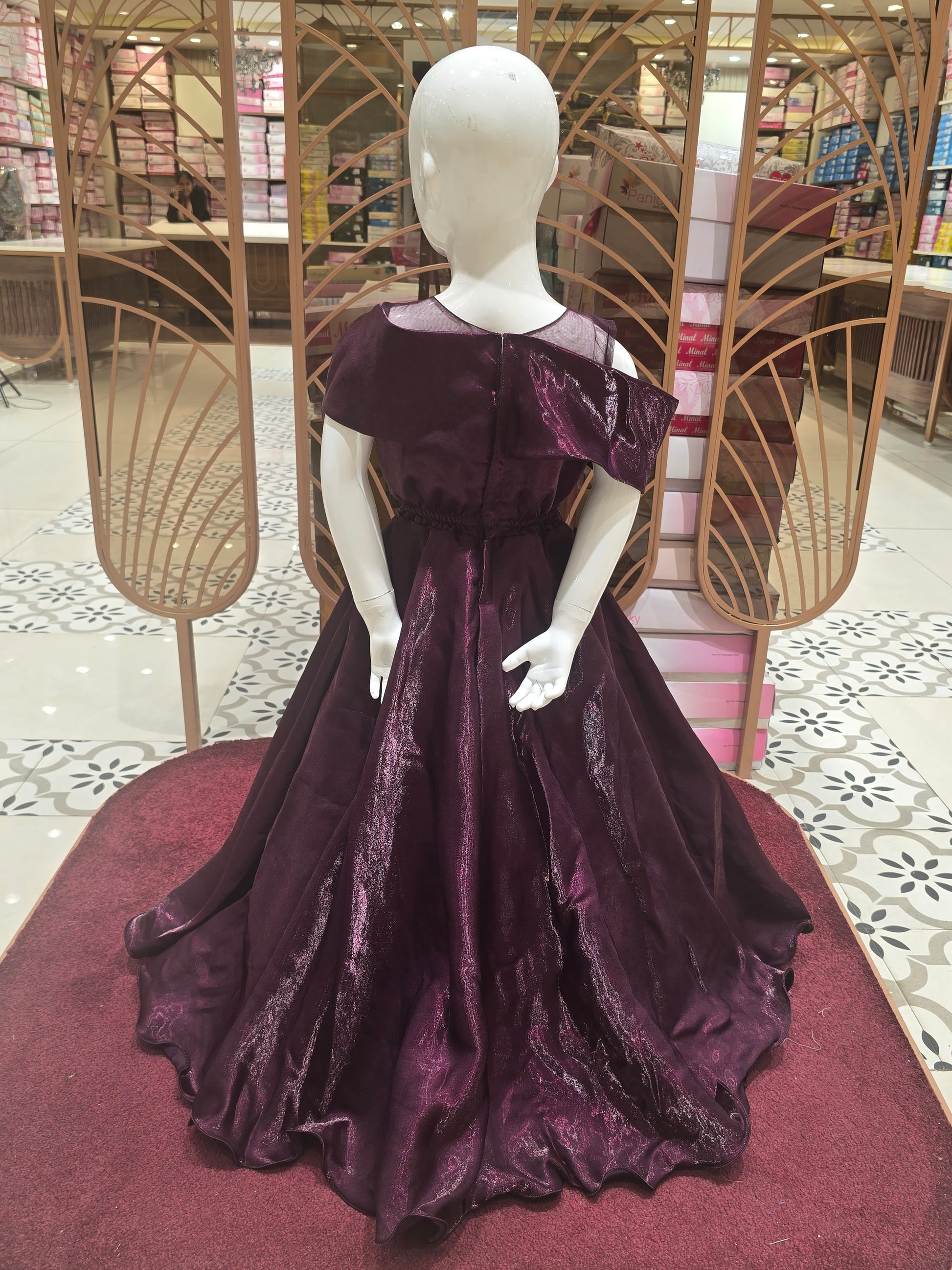 This elegant wine-colored satin sequence gown is designed to make your little girl stand out at any celebration. It features a stylish western-inspired shoulder drape and a beautifully crafted neck pattern that adds a touch of sophistication. The rich satin fabric combined with sequence detailing gives the outfit a luxurious shine, perfect for parties, functions, and special events. Lightweight, comfortable, and beautifully stitched, this gown is an ideal choice for creating a graceful and modern festive look.